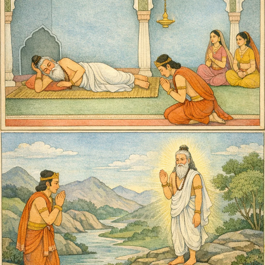 Chapter Arc: राजर्षि कुशिक, अपने गृह में ठहरे मुनिपुंगव च्यवन से विनयपूर्वक पूछते हैं—“भगवन्, यदि आप प्रसन्न हैं तो बताइए, मेरे घर में आपके निवास का कारण क्या है?” → च्यवन अपने विचित्र आचरणों का संकेत देते हैं—इक्कीस-इक्कीस दिनों तक एक करवट सोना, उठकर बिना कुछ कहे बाहर जाना, सहसा अन्तर्धान होना और फिर पुनः दर्शन देना—और कुशिक की सहनशीलता व धैर्य की परीक्षा लेते हैं। धीरे-धीरे स्पष्ट होता है कि यह केवल तपस्वी का स्वभाव नहीं, बल्कि एक उद्देश्यपूर्ण ‘परीक्षा’ है। → च्यवन सत्य उद्घाटित करते हैं: “मैं तुम्हारे कुल-नाश के हेतु आया था—कुशिकोच्छेद का संकल्प लेकर।” परंतु कुशिक की अविचल क्षमा, सेवा और क्रोध-रहित धैर्य ने उस संकल्प को पलट दिया; विनाश का हेतु वरदान में रूपान्तरित हो जाता है। → प्रसन्न होकर च्यवन कहते हैं—“राजर्षे, जो वर तुम्हारे मन में है, मांग लो; मैं तीर्थयात्रा को जाऊँगा।” कुशिक की निःशंक निष्ठा और अतिथि-धर्म के पालन से ऋषि संतुष्ट होते हैं और उसे कल्याणकारी फल का आश्वासन देते हैं। → वरदान का द्वार खुलता है—कुशिक क्या मांगेगा, और यह वर उसके वंश व राज्य-धर्म को किस दिशा में मोड़ेगा?