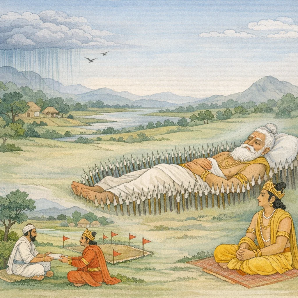 Chapter Arc: शरशय्या पर लेटे भीष्म युधिष्ठिर को दान-धर्म का शिखर दिखाते हैं—सब दानों में ‘पृथ्वीदान’ को अतिदान कहकर, अचल-अक्षय भूमि को इस लोक के उत्तम भोगों की ‘दोग्ध्री’ (दूध देने वाली) बताते हैं। → भीष्म भूमि के महत्त्व को केवल संपत्ति नहीं, जीवन-व्यवस्था के आधार के रूप में स्थापित करते हैं—मनुष्य इह-परत्र अपने कर्म से जीते हैं, और भूमि ‘महादेवी’ होकर दाता को प्रिय बनाती है। फिर वे दान की मात्रा/उद्देश्य के सूक्ष्म भेद उठाते हैं: एक घर के लिए दी गई भूमि से लेकर राज्य-धर्म तक, फल और दण्ड दोनों का विस्तार। → भूमिदान के फल-दण्ड का तीखा शिखर: ‘एकागारकरीं’ भूमि-दान करने वाला दीर्घ पुण्य पाता है, और उतनी ही भूमि का हरण करने वाला उससे भी बढ़कर नरक-यातना भोगता है—दान की महिमा के साथ अपहरण का भयावह प्रतिफल एक साथ उद्घाटित होता है। → भूमिदाता के लिए अभय-प्रतिज्ञा: काल-प्रेरित मृत्यु, दण्ड, तम, दारुण अग्नि और घोर पाश भी भूमिदाता के निकट नहीं आते; और जिस राजा के शुभ राज्य/कर्म से प्रजा योगक्षेम, वृष्टि और स्वकर्म-समृद्धि से बढ़ती है, वह भूमि-धर्म का सामाजिक रूप है। श्राद्ध-प्रसंग में इस माहात्म्य के श्रवण से राक्षस/असुर-भाग का निषेध और पितरों के निमित्त दान की अक्षयता बताकर उपदेश पूर्ण होता है। → भीष्म का समापन-प्रश्न—‘अब और क्या सुनना चाहते हो?’—अगले अध्याय के लिए युधिष्ठिर की जिज्ञासा को खुला छोड़ देता है।