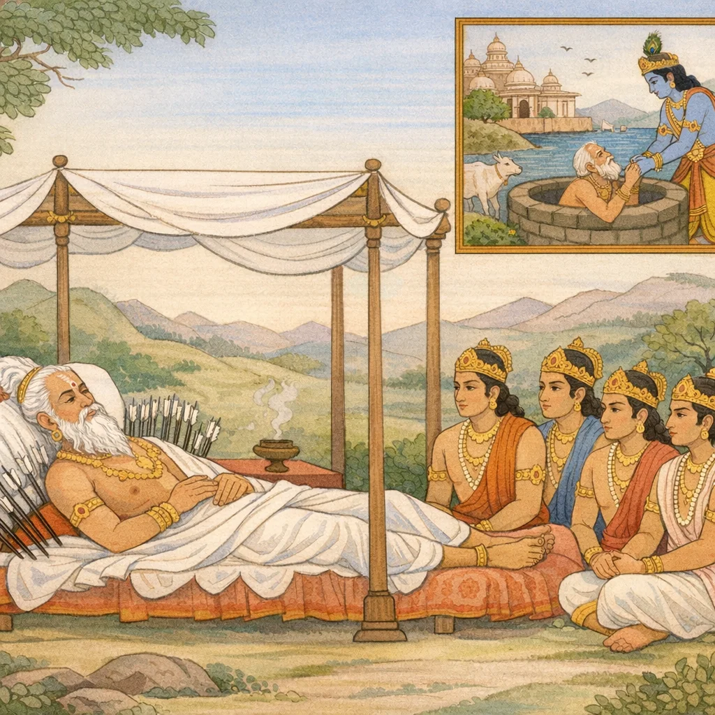 Chapter Arc: युधिष्ठिर, भीष्म के मुख से गोदान का माहात्म्य और नृग-राजा की एक अज्ञानजन्य भूल से उपजे महादुःख का प्रसंग सुनकर, ‘गोलोक’ और गोदान के फल के विषय में अपने भीतर उठे संदेह को प्रकट करते हैं। → वे प्रश्नों की शृंखला रखते हैं—गौओं का लोक वास्तव में कैसा है, गोदान कहाँ और कैसे फलित होता है, बहुत-सी और थोड़ी-सी गौओं के दान में भेद क्या है, और बिना प्रत्यक्ष गोदान किए भी ‘गोप्रदाता’ कहलाने का आधार क्या हो सकता है। नृग की कथा और द्वारका-स्थापन के समय कृष्ण द्वारा उनके उद्धार का स्मरण इस जिज्ञासा को और तीव्र कर देता है। → युधिष्ठिर का निर्णायक प्रश्न उभरता है—‘गोप्रदान में कौन-सी दक्षिणा विशेष श्रेष्ठ मानी जाती है?’—यही बिंदु दान के बाह्य परिमाण से हटकर उसके विधि, नीयत और पूर्णता (दक्षिणा सहित) की ओर अध्याय को मोड़ देता है। → अध्याय का स्वर प्रश्नोत्तरात्मक है: युधिष्ठिर अपनी जिज्ञासा को स्पष्ट, क्रमबद्ध और ‘तत्त्वतः’ जानने की आकांक्षा के साथ स्थापित करते हैं, जिससे आगे के उपदेश के लिए भूमि तैयार होती है—गोदान का फल, गोलोक का स्वरूप, और दान की शुद्धि के मानदंड। → भीष्म से अपेक्षित उत्तर—गोलोक का तत्त्व, गोदान की गणना (अल्प/बहु), और श्रेष्ठ दक्षिणा का निर्णायक विधान—अगले प्रसंग/अध्याय में विस्तार से आने हेतु शेष रह जाता है।