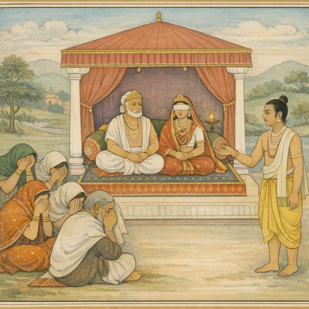 Chapter Arc: हस्तिनापुर की प्रजा और जनपदवासी वृद्ध धृतराष्ट्र के करुण वचनों को सुनकर शोक से स्तब्ध हो जाते हैं—मानो नगर का हृदय ही रो पड़ा हो। → धृतराष्ट्र अपने बुढ़ापे, पुत्र-नाश और गांधारी सहित वनवास की अनुमति का स्मरण कर अनेक प्रकार से विलाप करते हैं; जनसमुदाय मुख ढाँपकर पितृ-मातृवत् रोता है और यह भय उभरता है कि अब राज्य-जीवन का सहारा भी छिन जाएगा। → ब्राह्मण साम्ब आगे बढ़कर धृतराष्ट्र को सान्त्वना देता है—राजाओं के वध में आप कारण नहीं; युधिष्ठिर के संसर्ग से भीम-अर्जुन आदि प्रजा का अप्रिय नहीं करेंगे; अतः मन का शोक त्यागकर धर्म्य कार्यों में प्रवृत्त हों। → साम्ब के धर्मानुकूल, गुणयुक्त वचनों को समस्त प्रजा ‘साधु-साधु’ कहकर स्वीकार करती है; शोक का उफान कुछ थमता है और धृतराष्ट्र के लिए धर्म-आधारित आश्वासन बनता है। → वनगमन की अनिवार्यता और कुरुवंश के बचे हुए जनों पर उसके प्रभाव की छाया बनी रहती है।