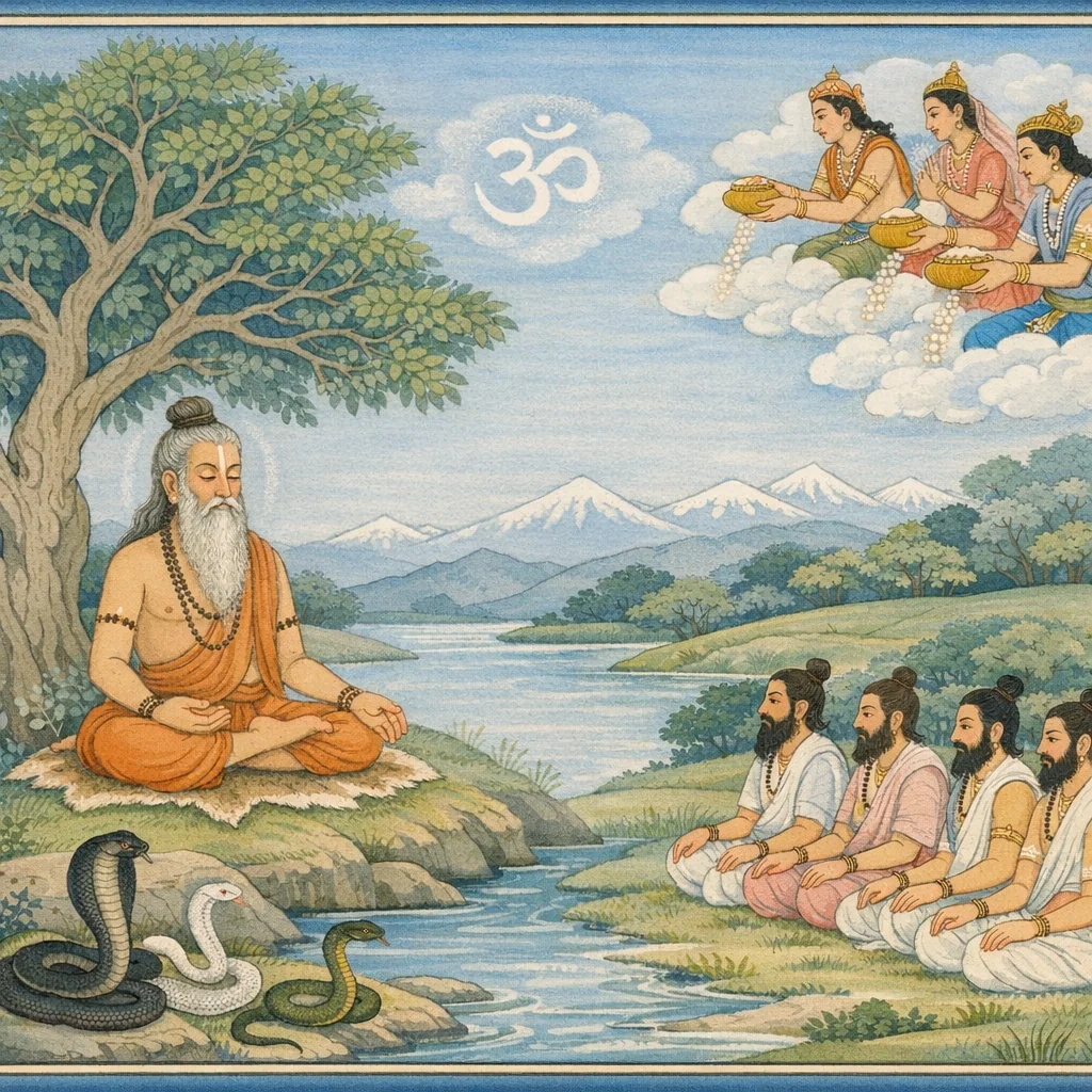 When those seekers inquired about the highest good, the Blessed Lord declared it to them: he bestowed the one-syllabled Brahman—‘Om’. Hearing that sacred sound of the praṇava, they hastened away, each to his own direction, as if the teaching itself had concluded their quest and sent them onward to their proper paths.