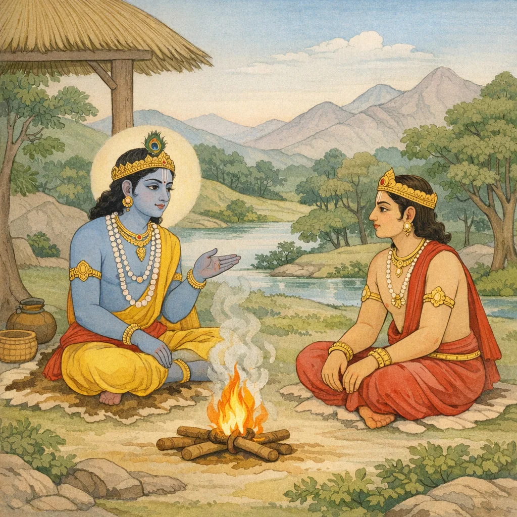 Chapter Arc: युद्धोत्तर शान्ति के बीच अर्जुन के भीतर एक सूक्ष्म प्यास उठती है—जिस ‘मति’ (आत्मबोध) से ब्राह्मणी ने क्षेत्रज्ञ का रहस्य जाना, वही बुद्धि उसे भी कैसे प्राप्त हो। → ब्राह्मण-उपदेश में प्रतीक-भाषा गाढ़ी होती जाती है: ब्राह्मणी को ‘अरणि’ (नीचे की लकड़ी), गुरु को ‘उत्तर-अरणि’ कहा जाता है; तप और श्रुति के मंथन से ‘ज्ञान-अग्नि’ प्रकट होती है। साथ ही क्षेत्रज्ञ के निर्गुण, अलिप्त, देह-संबंध से परे होने का कथन साधक के लिए चुनौती बनता है—जो प्रत्यक्ष दिखता है, वह अंतिम सत्य नहीं। → श्रीकृष्ण स्वयं निर्णायक व्याख्या देते हैं: ब्राह्मणी की मति ‘क्षेत्रज्ञ-संक्षय’ (क्षेत्र/देह-आसक्ति के क्षय) से उठती है और क्षेत्रज्ञ-ज्ञान के द्वारा परम की ओर प्रवृत्त होती है; फिर वे रहस्य को आत्मसात कर कहते हैं—‘मन को ब्राह्मण जानो, बुद्धि को ब्राह्मणी जानो; और जो क्षेत्रज्ञ कहा गया है, वह मैं ही हूँ।’ → उपदेश का उपसंहार इस निष्कर्ष पर टिकता है कि साधना का उपाय बाह्य नहीं, अंतःकरण में है—मन-बुद्धि के मंथन, गुरु-श्रुति-तप के अनुशासन, और प्रत्यक्ष-रूपों की सीमाओं को पहचानकर क्षेत्रज्ञ में स्थित होने से ही वह ‘मति’ उपलब्ध होती है।