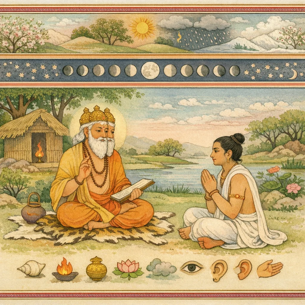 Brahmā said: “Sages, I shall now explain, in accordance with truth, everything—together with its names and defining marks—its beginning, its middle, and its end, and also the means by which it is to be apprehended. This teaching frames knowledge as a disciplined grasp of reality through clear definitions and right methods, so that understanding does not drift into confusion or mere opinion.”