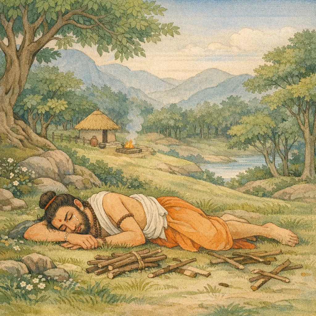 Vaiśaṃpāyana said: Then, together with the bundle of firewood, he fell to the ground. O king, subduer of foes—overwhelmed by the heavy load, he had become utterly exhausted; his body was pressed down by the weight of the wood and he was tormented by hunger. When he reached the hermitage and tried to set the burden down, his matted locks—white like silver threads—had become caught in the wood, and so they too fell to the earth along with the logs.