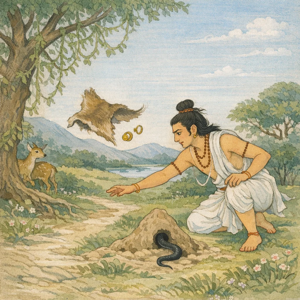 Vaiśampāyana said: “Then, with the jeweled earrings in his possession, he swiftly entered an anthill. In the surrounding narrative, once the dark deerskin fell to the ground after the bonds were broken, the serpent Takṣaka—born in the lineage of Airāvata—noticed it, saw the gem-like earrings kept within the hide, seized them in his teeth, and disappeared into an anthill. The episode underscores how negligence and attachment to valuables invite opportunistic harm, and how hidden greed can exploit moments of vulnerability.”