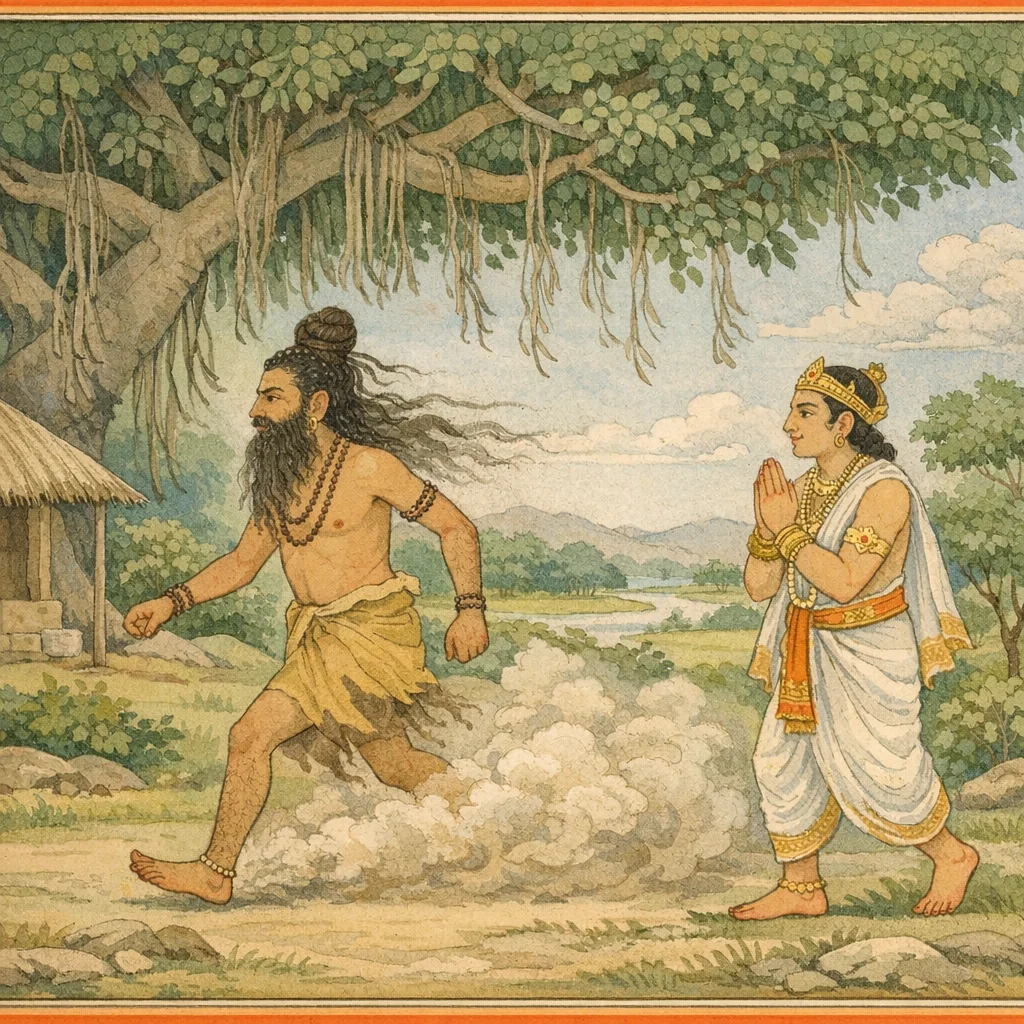 Then Saṃvarta turned back and sat down, weary. Seeking the cool shade of a many-branched banyan tree, he rested—like a sage pausing to regain composure and strength before the next step of his purpose.