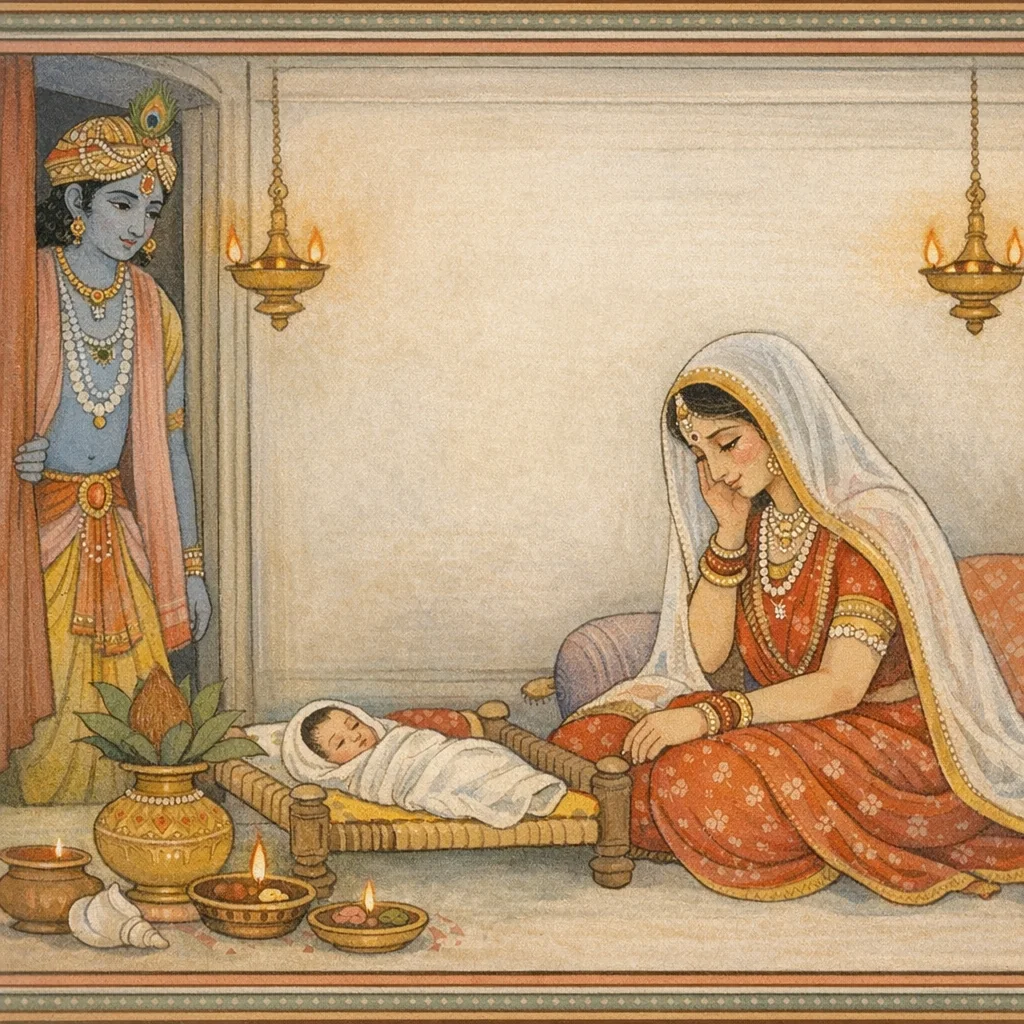 Chapter Arc: युद्धोत्तर शोक के बीच श्रीकृष्ण प्रसूतिकागृह में प्रवेश करते हैं—जहाँ उत्तराका नवजात पुत्र निष्प्राण पड़ा है और राजवंश का भविष्य एक क्षण में डगमगा गया है। → उत्तराका विलाप तीव्र होता जाता है; वह अपने पुत्र को पिता-अभिमन्यु के समान ‘कृतघ्न’ कहकर भीषण शोक में डूबती है और पाण्डव-श्री के लोप का भय सब पर छा जाता है। प्रसूतिकक्ष का विधिवत् सुसज्जित, पवित्र वातावरण (कलश, घृत, सरसों, अग्नि, अस्त्र-पूजन) इस त्रासदी को और तीखा बनाता है। → गोविन्द को आते देखकर उत्तराका करुण क्रन्दन चरम पर पहुँचता है—वह अपने पुत्र को जीवित करने के लिए श्रीकृष्ण से प्रार्थना करती है; समस्त आशा अब एक ही ‘अपराजित’ आश्रय पर टिक जाती है। → श्रीकृष्ण का प्रसूतिकागृह में उपस्थित होना स्वयं आश्वासन बनता है—उनके वचन और निकटता से शोकाकुल जनों को शीतलता मिलती है (धूप से तपे को जल-शान्ति की उपमा)। अध्याय का अंत उत्तराके निवेदन और कृष्ण के आश्वस्तकारी सान्निध्य पर ठहरता है। → क्या श्रीकृष्ण अपने अचिन्त्य सामर्थ्य से परीक्षित को पुनर्जीवित करेंगे, और कुरुवंश की दीपशिखा फिर जलेगी?