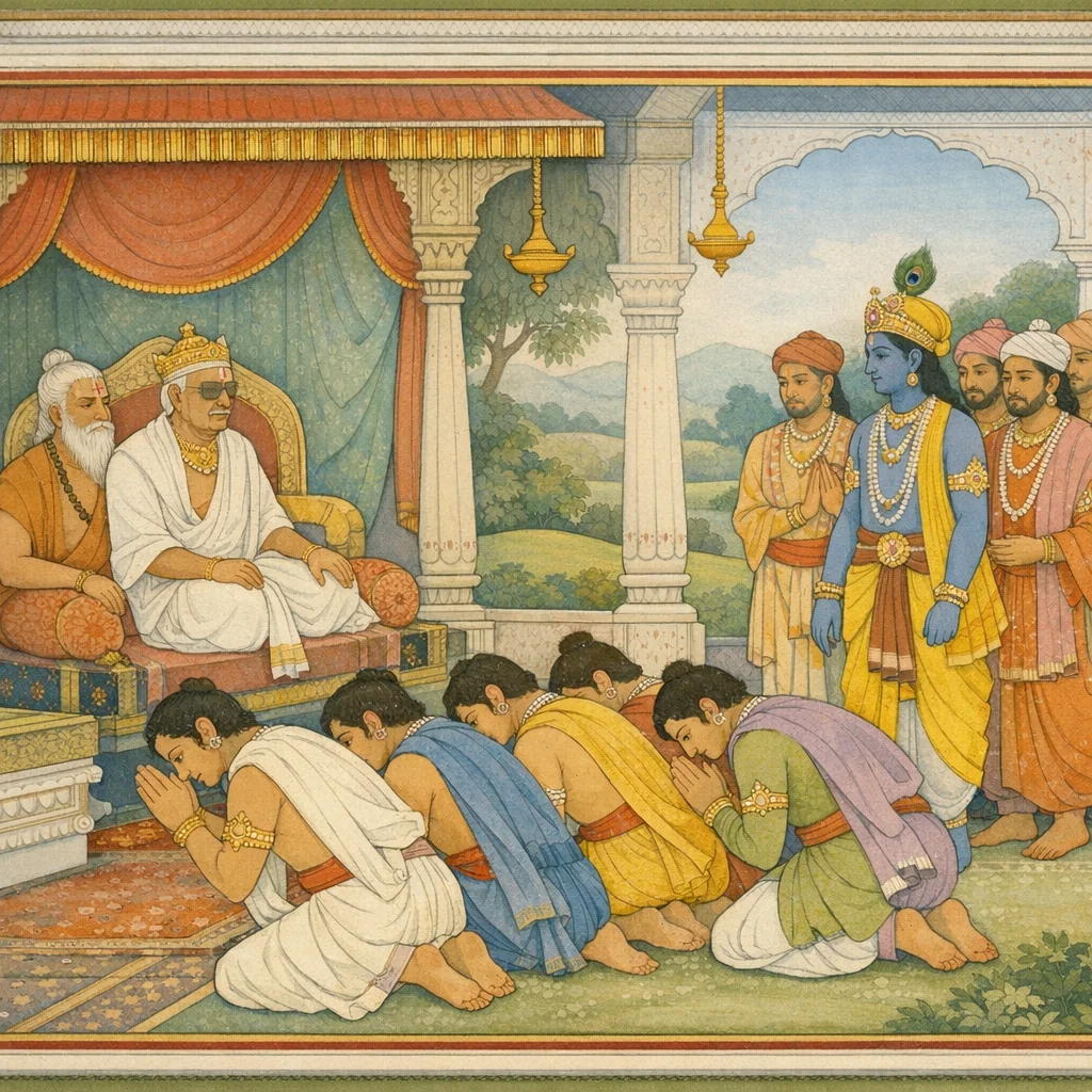Chapter Arc: युद्धोत्तर शान्ति के बीच नगर के द्वार पर धूल-धूसरित परन्तु तेजस्वी पाण्डवों का आगमन होता है; उन्हें देखने की उत्कंठा से वृष्णि-वीर और स्वयं भगवान् श्रीकृष्ण यथान्याय प्रत्युद्गमन करते हैं। → महासैन्य के खुर-नेमि-स्वन से नगर गूँज उठता है; पाण्डव क्रमशः विदुर, वैश्या-पुत्र (संजय) आदि पूज्य जनों का सत्कार करते हुए राजपरिवार से मिलने बढ़ते हैं, और सबके मन में युद्ध के बाद धर्म-राज्य की दिशा को लेकर मौन प्रश्न उठता है। → पाण्डव अपना-अपना नाम बताकर धृतराष्ट्र के चरणों में प्रणाम करते हैं; फिर व्यास के सान्निध्य में बैठकर संवाद होता है और युधिष्ठिर के भीतर ‘अश्वमेध’ के संकल्प का निर्णायक उदय होता है—राजधर्म की पुनर्स्थापना हेतु महाक्रतु का मार्ग। → व्यास के वचन से प्रेरित होकर धर्मात्मा युधिष्ठिर अश्वमेध के आयोजन का निश्चय करता है; वृष्णि-अन्धक वीरों की उपस्थिति में वह प्राप्त रत्न/उपहार को अश्वमेध में उपयोग करने की इच्छा प्रकट करता है। → अश्वमेध की तैयारी आरम्भ होने से पहले—यह महायज्ञ किन-किन परीक्षाओं, विरोधों और अनपेक्षित घटनाओं को जन्म देगा?