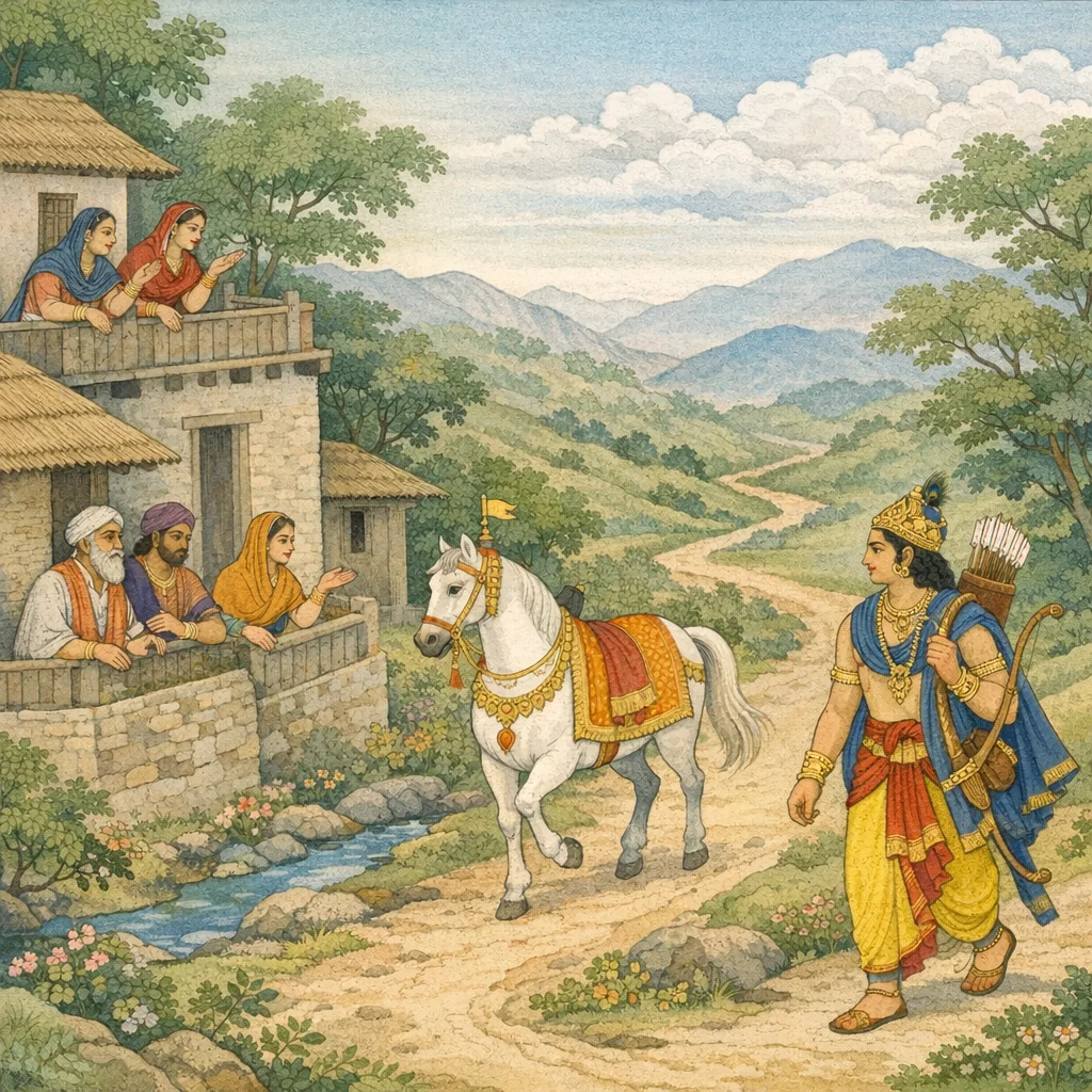 Chapter Arc: दीक्षा-काल आते ही महर्षि-ऋत्विज विधिवत् यज्ञ-क्रम आरम्भ कराते हैं; धर्मराज युधिष्ठिर पशुबन्ध-कर्म कर दीक्षित होकर तेज से दीप्त हो उठते हैं। → अश्वमेध हेतु व्यास के शास्त्र-विधान से छोड़ा गया घोड़ा दिशाओं में विचरने लगता है। उसके पीछे महाबाहु अर्जुन धनुष को स्पर्श करते हुए अनुगमन करता है; नगर-जन और पथिक उसकी कीर्ति, शस्त्र-तेज और यज्ञ-रक्षा की चर्चा करते हैं—पर साथ ही यह संकेत भी है कि घोड़े का मार्ग अनिश्चित है और कहीं भी विघ्न/प्रतिरोध उठ सकता है। → घोड़ा पृथ्वी की प्रदक्षिणा-सी करता हुआ उत्तर-पूर्व की ओर बढ़ता है; भीड़ में लोग अर्जुन को प्रत्यक्ष न देख पाने पर भी उसके दिव्य धनुष-चिह्न से पहचानते हैं—यह क्षण अर्जुन की अदृश्य-सी, किंतु सर्वत्र अनुभूत उपस्थिति और यज्ञ-प्रतिष्ठा के विस्तार को चरम पर ले आता है। → अर्जुन स्त्री-पुरुषों की मधुर वाणी और शुभाशंसाएँ बार-बार सुनता हुआ आगे बढ़ता है। विघ्न-शान्ति के लिए याज्ञवल्क्य के एक वेदपारग, यज्ञकर्म-कुशल शिष्य को पार्थ के साथ प्रेषित किया जाता है, जिससे यात्रा और यज्ञ दोनों की रक्षा सुनिश्चित हो। → घोड़ा अभी भी दिशाओं में विचर रहा है—आगे किस देश/राजा के यहाँ प्रतिरोध होगा और अर्जुन को किस धर्म-संकट का सामना करना पड़ेगा, यह अनकहा रह जाता है।