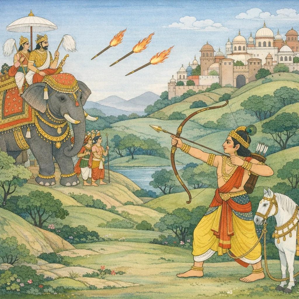 Chapter Arc: अश्वमेध का उत्तम घोड़ा प्राग्ज्योतिष की सीमा में प्रवेश करता है, और भगदत्त-पुत्र राजा वज्रदत्त उसे बलपूर्वक पकड़कर नगराभिमुख ले जाने को उद्यत होता है—यज्ञ की प्रतिष्ठा को सीधी चुनौती। → अर्जुन घोड़े की रक्षा हेतु सामने आता है। वज्रदत्त नगर से निकलकर युद्ध-सज्जा करता है, फिर गाण्डीव के बाणों से व्याकुल होकर भी पुनः नगर में प्रवेश कर श्रेष्ठ गजराज पर आरूढ़ होकर राजचिह्नों सहित (श्वेत छत्र, चामर) रणभूमि में लौटता है। दोनों ओर से अस्त्र-वर्षा तीव्र होती जाती है; वज्रदत्त अग्नि-सदृश तोमर धनंजय पर फेंकता है। → वज्रदत्त के उग्र प्रहार देखकर अर्जुन का क्रोध प्रज्वलित होता है; वह हाथी पर सर्प-सम भयंकर, अग्नि-तुल्य तेजस्वी बाणों की वर्षा कर वज्रदत्त की रण-गति को तोड़ देता है और अश्व को छुड़ाने हेतु निर्णायक बढ़त बना लेता है। → वज्रदत्त की चुनौती निष्फल होती है; अर्जुन अश्वमेध-घोड़े की रक्षा करते हुए प्राग्ज्योतिष में अपनी विजय-प्रतिष्ठा स्थापित करता है और यज्ञ-यात्रा आगे बढ़ने योग्य हो जाती है। → अर्जुन की दिग्विजय-यात्रा में अगला कौन-सा राजा अश्व को रोककर धर्म-प्रतिष्ठा की परीक्षा लेगा?