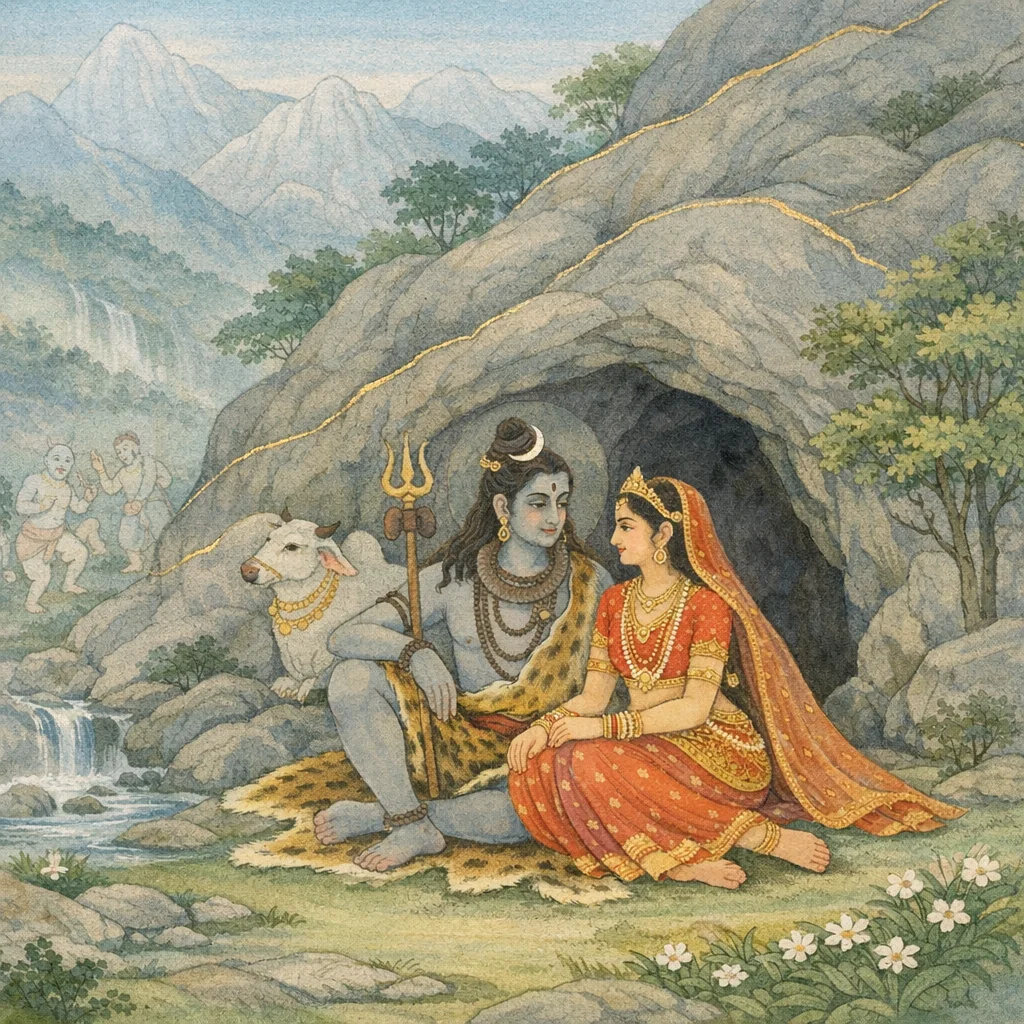 Saṁvarta said: “At the roots of trees, on low and rugged uneven heights, and within the caves of the king of mountains, the supremely radiant Lord Maheśvara—bearing the trident—dwells eternally with Goddess Umā, surrounded by hosts of diverse beings, abiding as he wills and in perfect ease.”