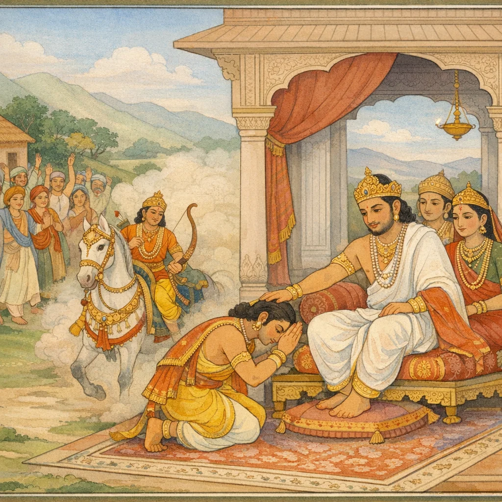 Chapter Arc: अश्वमेध-यज्ञ के आरम्भ के पश्चात् कथा का प्रवाह युद्धोत्तर शान्ति से हटकर एक नई बेचैनी पर टिकता है—हृषीकेश कृष्ण के सामने यह प्रश्न उठता है कि सर्वविजयी अर्जुन भीतर से सुखविवर्जित क्यों रहता है। → कृष्ण के प्रति जिज्ञासा गहराती है: सुना गया है कि अनेक देशों में फिर-फिर युद्ध हुए; अर्जुन जहाँ-जहाँ गया, वहाँ धूल-धूसरित घोड़े के पीछे राजाओं की हलचल, जन-समूह की हर्षध्वनि और विजय-यात्रा का कोलाहल उठा। पर इस बाहरी जय के बीच अर्जुन के मन का भार कथा को कसता जाता है। → अर्जुन की वापसी का दृश्य चरम पर पहुँचता है—रेणु-राशि उठती है, जनों की हर्षकारी वाणी गूँजती है, और अर्जुन धर्मराज युधिष्ठिर के चरणों में प्रणाम कर भीमादि भ्राताओं का पूजन करता हुआ केशव (कृष्ण) के समीप बैठता है; विजय-समाचार के साथ ही युधिष्ठिर की आँखों में आनन्दाश्रु छलकते हैं और दूत/वृत्तान्त-निवेदक को बहुधन दान दिया जाता है। → कुरु-सभा में स्वागत-सत्कार के बाद अर्जुन थके हुए पारगामी की भाँति विश्राम पाता है; विजय-यात्रा का औपचारिक समापन और राजसभा की स्वीकृति से अश्वमेध का अभियान स्थिरता की ओर लौटता है। → बभ्रुवाहन का अपनी दोनों माताओं सहित कुरुदेश में आगमन एक नया प्रसंग खोलता है—यह आगमन केवल शुभ-संदेश है या किसी पुराने बन्धन/प्रतिज्ञा का पुनः स्मरण?