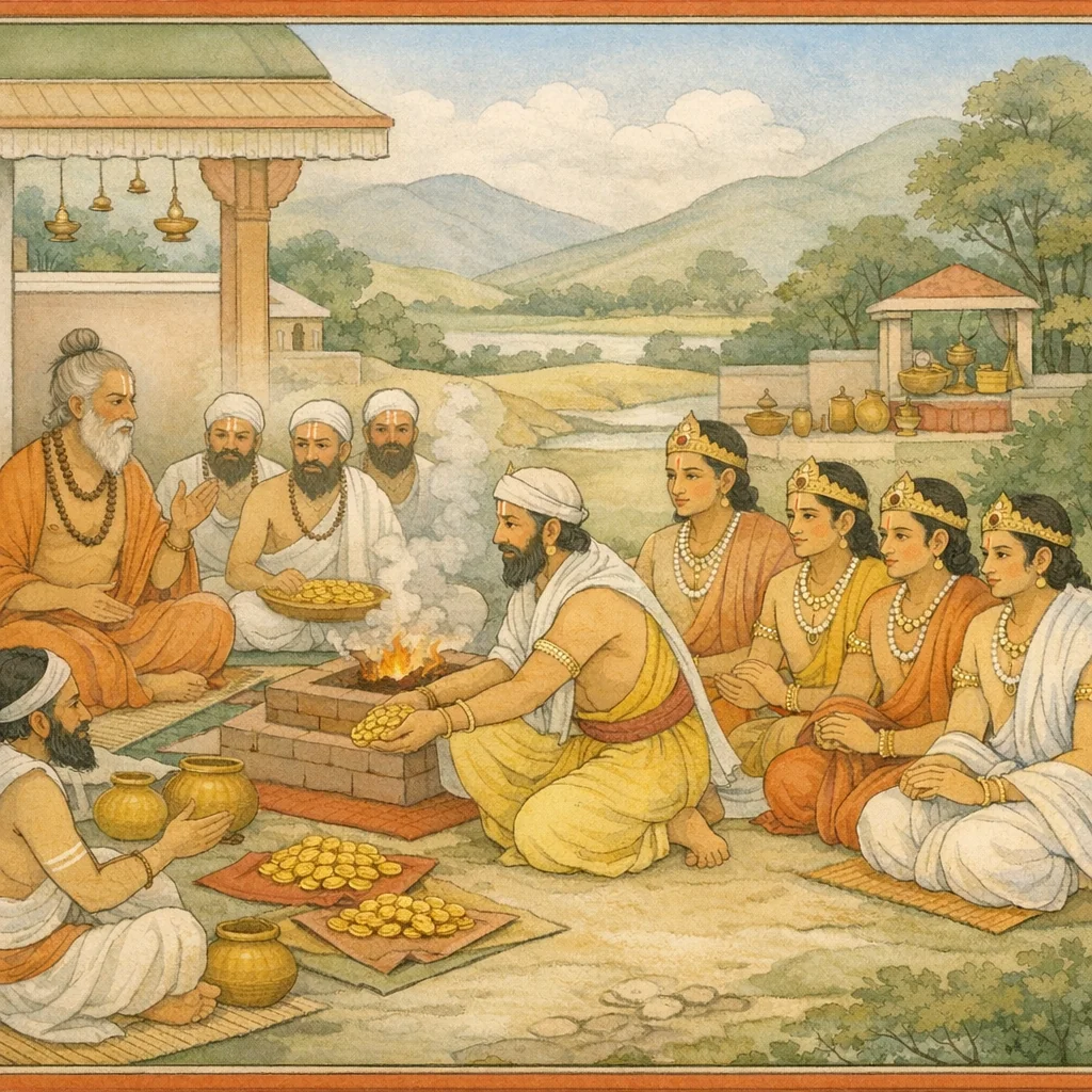 Chapter Arc: वैशम्पायन यज्ञ-भूमि का द्वार खोलते हैं—अश्वमेध का विधिवत् अनुष्ठान आरम्भ हो चुका है; युधिष्ठिर के सामने अब विजय का नहीं, ‘यज्ञ-पूर्णता’ और ‘दान-पूर्णता’ का कठिन धर्म खड़ा है। → याजक अश्व का संस्कार करते हैं, वपा-उद्धरण आदि शास्त्रोक्त क्रियाएँ होती हैं; राजाओं का सत्कार, विदाई और दक्षिणा-वितरण का विराट आयोजन फैलता जाता है। दान की मात्रा ‘पृथ्वी-मूल्य’ सुवर्ण तक पहुँचती है—इतना कि व्यवस्था, न्याय और संतोष बनाए रखना स्वयं एक परीक्षा बन जाता है। → द्वैपायन व्यास ब्राह्मणों के मध्य युधिष्ठिर की प्रशंसा करते हुए उसके यज्ञ, दान और धर्म-स्थैर्य को प्रतिष्ठित करते हैं; उसी क्षण दान का चरम दृश्य उभरता है—अनन्त-सा सुवर्णराशि ऋत्विजों द्वारा ब्राह्मणों में बाँटी जाती है और यज्ञ की कीर्ति दिशाओं में फैलती है। → युधिष्ठिर भाइयों सहित ‘धूतपाप’ और ‘जितस्वर्ग’ भाव से प्रसन्न होता है; बभ्रुवाहन जैसे अतिथिराज को बुलाकर विपुल धन देकर सम्मानपूर्वक विदा किया जाता है; श्रीकृष्ण, बलदेव, प्रद्युम्न आदि का यथाविधि पूजन कर उन्हें भी प्रस्थान कराया जाता है। → घोषणा दिन-रात गूँजती रहती है—‘जिसकी जैसी इच्छा हो, वही वस्तु दी जाए’—और यह संकेत छोड़ती है कि यज्ञ-समृद्धि के बाद भी लोक-आकांक्षाओं का प्रवाह थमता नहीं, आगे नई कथाएँ और नई कसौटियाँ प्रतीक्षा में हैं।