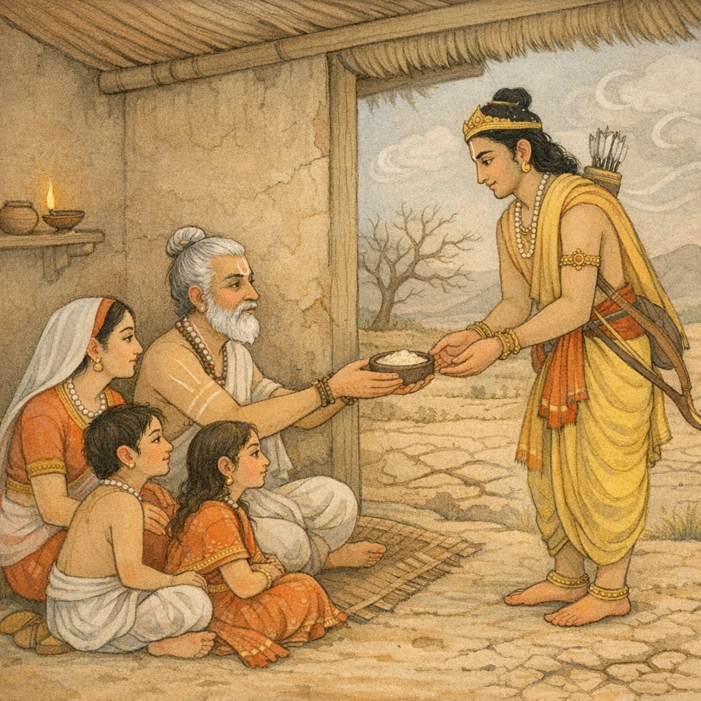 Nakula said: “Please accept this quarter-portion of a prastha of roasted barley flour (sattu). Be gracious to me.” In the ethical frame of the episode, the speaker offers even a meagre share with humility, treating hospitality and right conduct (dharma) as paramount despite scarcity.