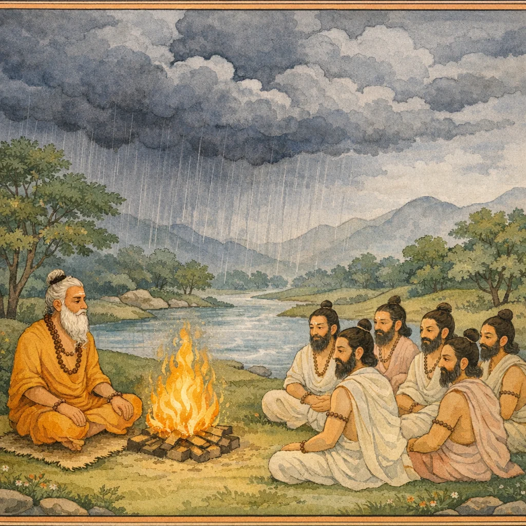 Chapter Arc: जनमेजय जिज्ञासा करता है—यदि धर्मयुक्त त्याग से स्वर्ग मिलता है, तो अगस्त्य के यज्ञ में ‘उच्छवृत्ति’ और ‘सक्तुदान’ जैसे अल्प साधनों से भी इतना महान फल कैसे सिद्ध हुआ? → वक्ता (वैशम्पायन) उच्छवृत्ति-धर्म का प्रताप बताते हुए प्रश्न को तीखा करते हैं—सभी यज्ञों में यह ‘परम निश्चय’ कैसे टिके, और जब इन्द्र वर्षा रोक दे (द्वादश वर्षों तक) तब भी यज्ञ कैसे चले? अगस्त्य का संकल्प इन्द्र की शक्ति-राजनीति से टकराता है; ऋषि-समाज यज्ञ की सिद्धि और लोक-कल्याण के बीच संतुलन खोजता है। → अगस्त्य मुनियों को प्रणाम कर प्रसन्न करते हुए निर्भय घोषणा करते हैं—‘इन्द्र वर्षा करे या न करे, मुझे परवा नहीं; मेरा यज्ञ व्यर्थ नहीं होगा।’ वे उत्तरकुरु की समृद्धि, स्वर्गसदृश ऐश्वर्य, और दिव्य समुदाय (अप्सरा, गन्धर्व, किन्नर, विश्वावसु आदि) को स्वयं यज्ञ में उपस्थित होने का आह्वान करते हैं—यह संकल्प-शक्ति का शिखर है। → ऋषि-वृन्द धर्मशास्त्रीय विधि से सत्र-यज्ञ की समाप्ति और विसर्जन की बात करते हैं; अहिंसारहित बुद्धि और तपस्या-मार्ग की प्रशंसा होती है। अगस्त्य के तपोबल और यज्ञ-निष्ठा को देखकर इन्द्र का हठ टूटता है और वह निकामवर्षी होकर वर्षा आरम्भ कर देता है।