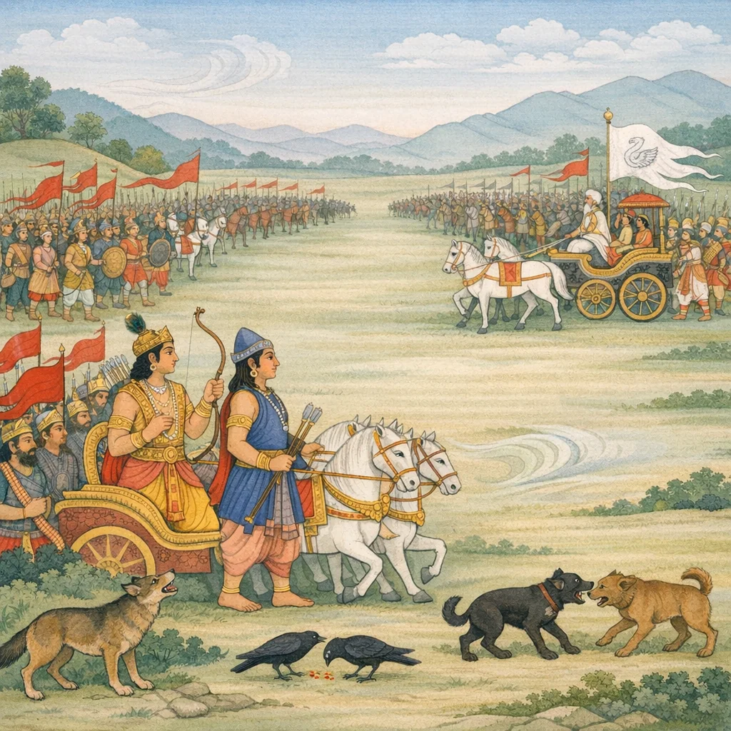Sañjaya said: “O venerable one, there were many kinds of ominous cries and howls there. On every side jackals and powerful crows swooped down, and dogs too were seen barking in varied tones. Such portents, arising amid the field of slaughter, signal the moral darkness and impending ruin that accompany adharma in war.”