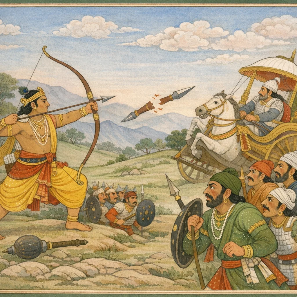 Sañjaya said: The son of the Wind-god (Bhīmasena) split the tomara in two with a razor-headed arrow; and with three shafts he cut the paṭṭiśa to pieces, as one would sever the stalk of a tilaka plant. The scene reveals Bhīma’s fierce resolve and martial discipline—meeting deadly weapons not with rage alone, but with controlled skill and unwavering purpose.
