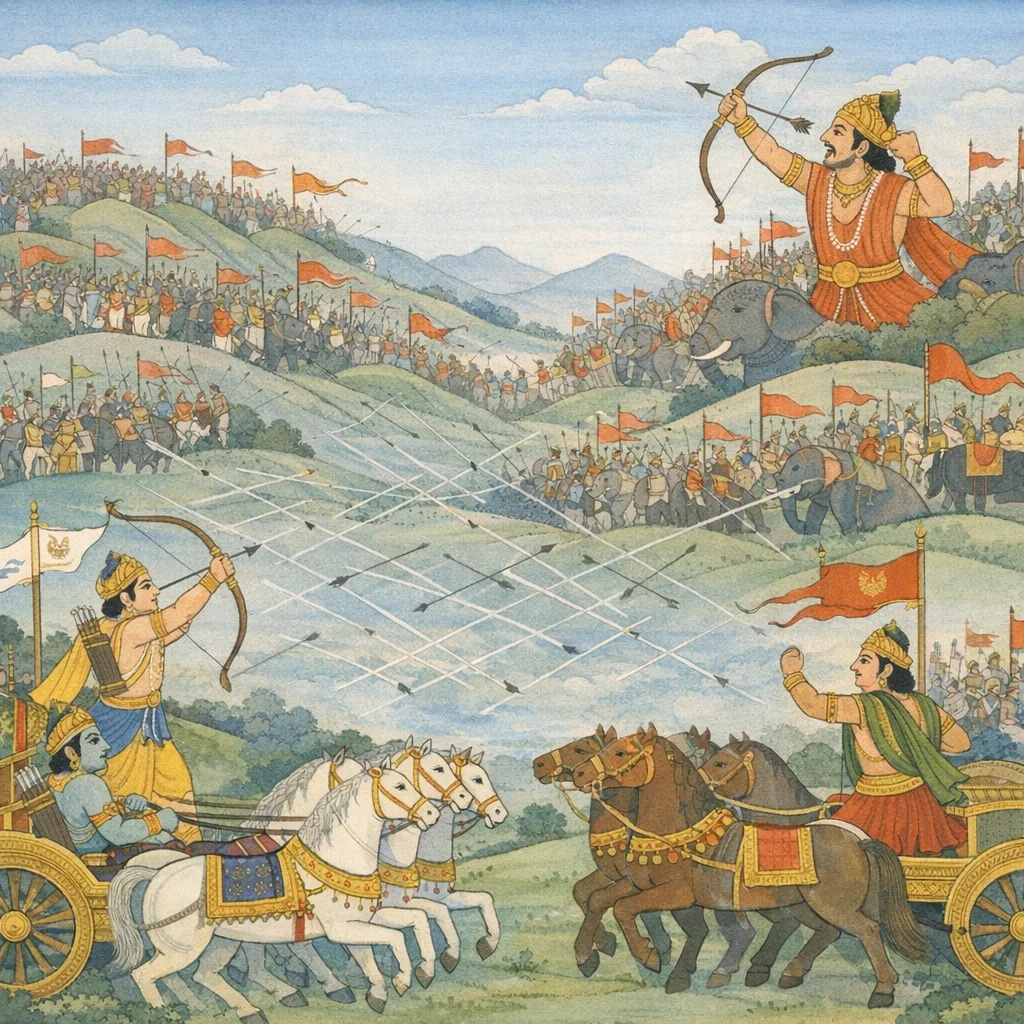 Chapter Arc: भीषण संग्राम में पाण्डव-सेना के अग्रभाग पर शत्रु-वीरों का घेरा कसता है; भीम और अर्जुन को लक्ष्य बनाकर अनेक महारथी एक साथ बढ़ते हैं। → सुशर्मा, कृप, जयद्रथ (सैन्धव), प्राग्ज्योतिष-नरेश, चित्रसेन, विकर्ण, कृतवर्मा, दुर्मर्षण तथा अवन्ति के विन्द-अनुविन्द—सब मिलकर पाण्डवों के प्रमुख रथियों को रोकने का प्रयत्न करते हैं; बाण-वर्षा में अर्जुन-भीम घायल किए जाते हैं और शत्रु-सेना का उत्साह बढ़ता है। → भीम-सेन और अर्जुन पर एक साथ तीव्र आक्रमण होता है—जयत्सेन जैसे योद्धा भीम को अनेक तीक्ष्ण बाणों से बेधते हैं; प्रत्युत्तर में पाण्डव-पक्ष भीषण प्रतिघात करता है और रणभूमि में गर्जना-निनाद से दोनों सेनाएँ थर्रा उठती हैं। → अध्याय का अंत निर्णायक वध पर नहीं, बल्कि ‘भीम-अर्जुन-पराक्रम’ के प्रदर्शन पर टिकता है—पाण्डवों की अग्र-रेखा टूटती नहीं; शत्रु-वीर भी युद्धभूमि नहीं छोड़ते और संघर्ष बराबरी की ज्वाला में बना रहता है। → अगले क्षण किसका रथ टूटेगा—भीम-अर्जुन का प्रतिघात भारी पड़ेगा या संयुक्त कौरव-आक्रमण पाण्डव-सेना को पीछे ढकेलेगा—युद्ध इसी अनिर्णीत उत्कर्ष पर लटकता है।