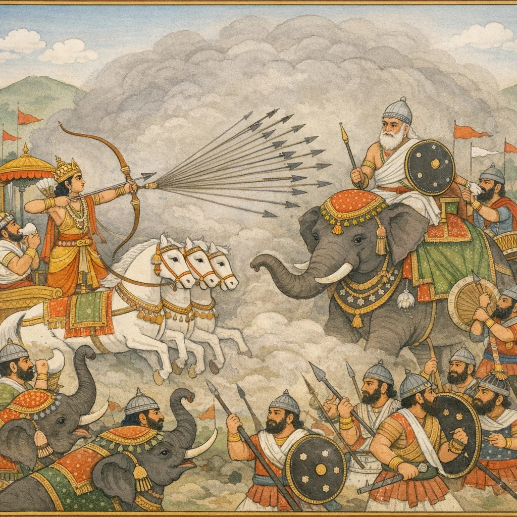 Sañjaya said: In that great battle, chariot-warriors and horses crashed upon one another in mutual onslaught. Elephants struck down elephants, and foot-soldiers slew foot-soldiers—an image of war’s blind reciprocity, where each class of fighter meets its like and violence multiplies without discrimination.