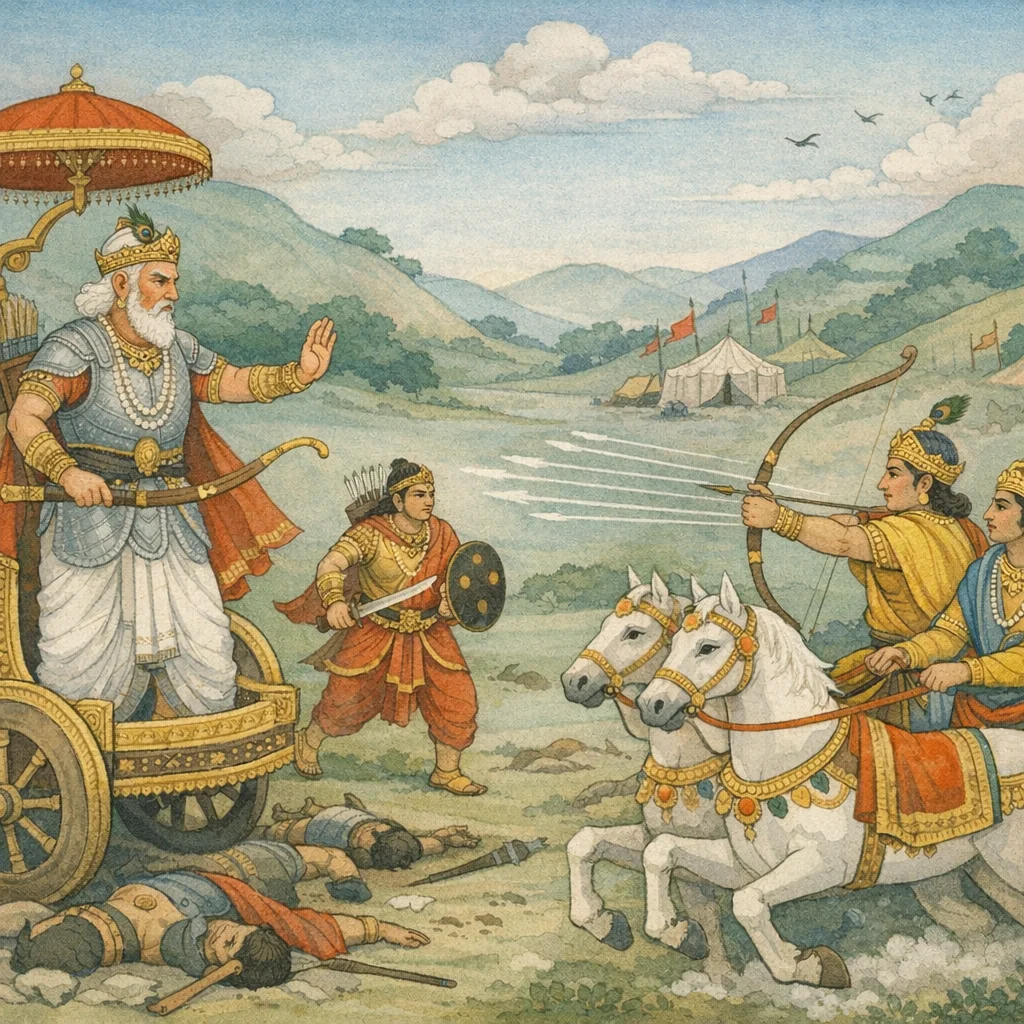 Sañjaya said: In the midst of battle, Arjuna set in motion a mighty river whose waters were blood, flowing between the armies of the Kurus and the Pāṇḍavas, O Bhārata. The image underscores the terrible moral cost of war: even when fought for a righteous end, the field is drenched in suffering, and heroic prowess becomes inseparable from the tragedy it creates.