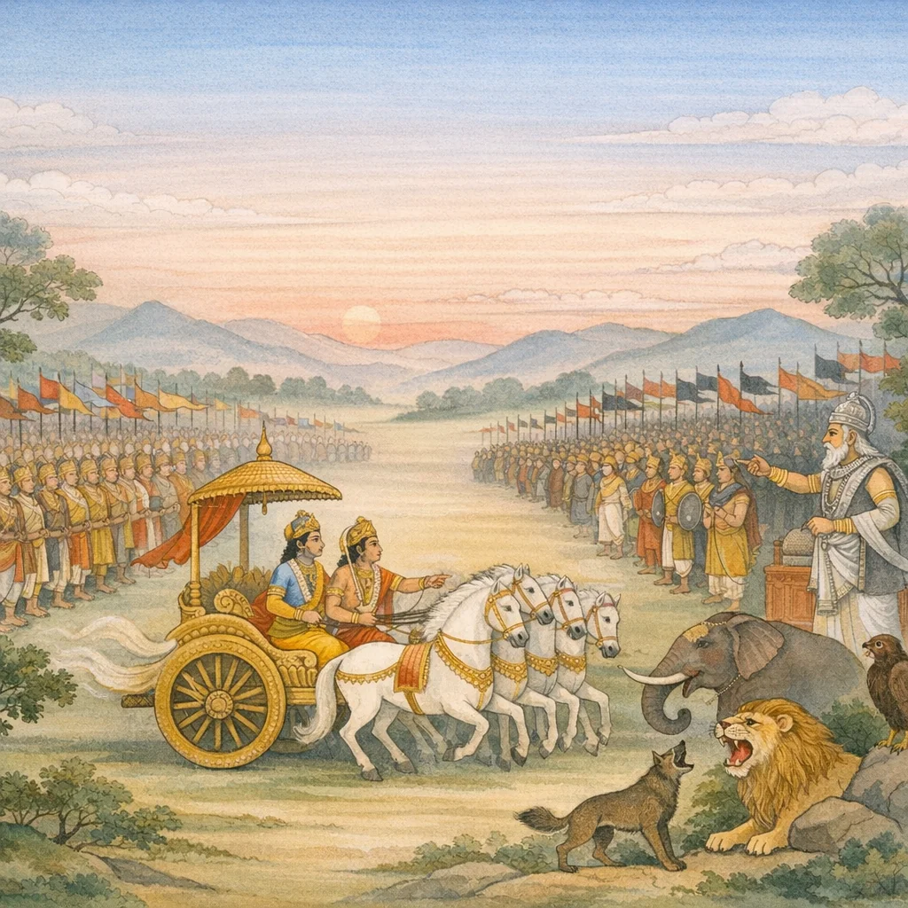 Chapter Arc: धृतराष्ट्र संजय से पूछते हैं—सूर्योदय के समय किस पक्ष के योद्धा युद्ध-इच्छा से अधिक हर्षित और उत्सुक दिख रहे थे, जब भीष्म के नेतृत्व में दोनों सेनाएँ निकट आ चुकी थीं। → संजय दोनों सेनाओं का समतुल्य, चित्र-विचित्र, रथ-गज-अश्व से परिपूर्ण दृश्य रचते हैं; साथ ही अपशकुन उभरते हैं—पाण्डवों की पीठ पर अनुकूल वायु, कौरव-पक्ष की ओर हिंसक पशुओं की ध्वनियाँ, और कौरवों के हाथियों का पाण्डव गजराजों की मदगन्ध से विचलित होना। → संजय निर्णायक संकेत देते हैं—धृतराष्ट्र की ध्वजिनी भले ‘अनन्तरूपा’ और ‘भीमा’ हो, पर वह पाण्डवों की सेना जैसी नहीं; क्योंकि पाण्डव-पक्ष में नेतृत्व केशव (कृष्ण) और अर्जुन के हाथ में है—यही युद्ध-भाग्य का धुरी-बिंदु बनता है। → भीष्म के द्वारा प्रतिदिन नये-नये व्यूह (मानुष, दैव, गान्धर्व, आसुर) रचने और कौरव-सेना के घोष-समुद्र-सा उमड़ने का वर्णन कर संजय युद्ध-व्यवस्था की व्यापकता स्थापित करते हैं, पर साथ ही संकेत करते हैं कि केवल संख्या नहीं, नेतृत्व और धर्म-बल निर्णायक होंगे। → सूर्योदय के साथ व्यूह-रचना पूर्ण है; अब प्रथम टकराव की घड़ी निकट है—किसका उत्साह टिकेगा और किसके अपशकुन फलित होंगे?