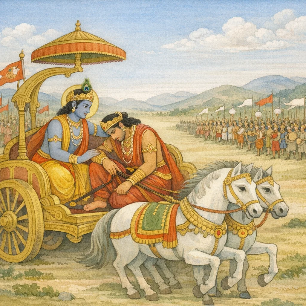 Chapter Arc: धृतराष्ट्र की अंधी जिज्ञासा—धर्मभूमि कुरुक्षेत्र में युद्ध-इच्छुक मेरे और पाण्डु के पुत्रों ने क्या किया?—और संजय की दृष्टि से रणभूमि का उद्घाटन। → दुर्योधन आचार्य द्रोण के पास जाकर पाण्डव-सेना की व्यूह-रचना और प्रमुख महारथियों का बखान करता है; दोनों पक्षों के शंखनाद से आकाश-पृथ्वी गूँज उठते हैं और युद्ध का अनिवार्यत्व सघन हो जाता है। → अर्जुन कृष्ण से रथ को दोनों सेनाओं के बीच ले चलने को कहता है; स्वजन-समुदाय—गुरु, पितामह, बंधु, ससुराल-पक्ष—को सामने देखकर उसका शरीर काँपता है, धनुष हाथ से गिरता है, और वह विजय-राज्य-सुख की आकांक्षा त्याग देता है। → अर्जुन स्वजन-वध के पाप, कुल-क्षय और धर्म-नाश की आशंका से करुणा-विषाद में डूबकर युद्ध से विरत होने की घोषणा करता है और रथ में बैठकर धनुष-बाण छोड़ देता है। → रणभूमि के मध्य, शोक-संविग्न अर्जुन मौन और असहाय—अब कृष्ण क्या उत्तर देंगे, और धर्म का मार्ग कैसे स्पष्ट होगा?
