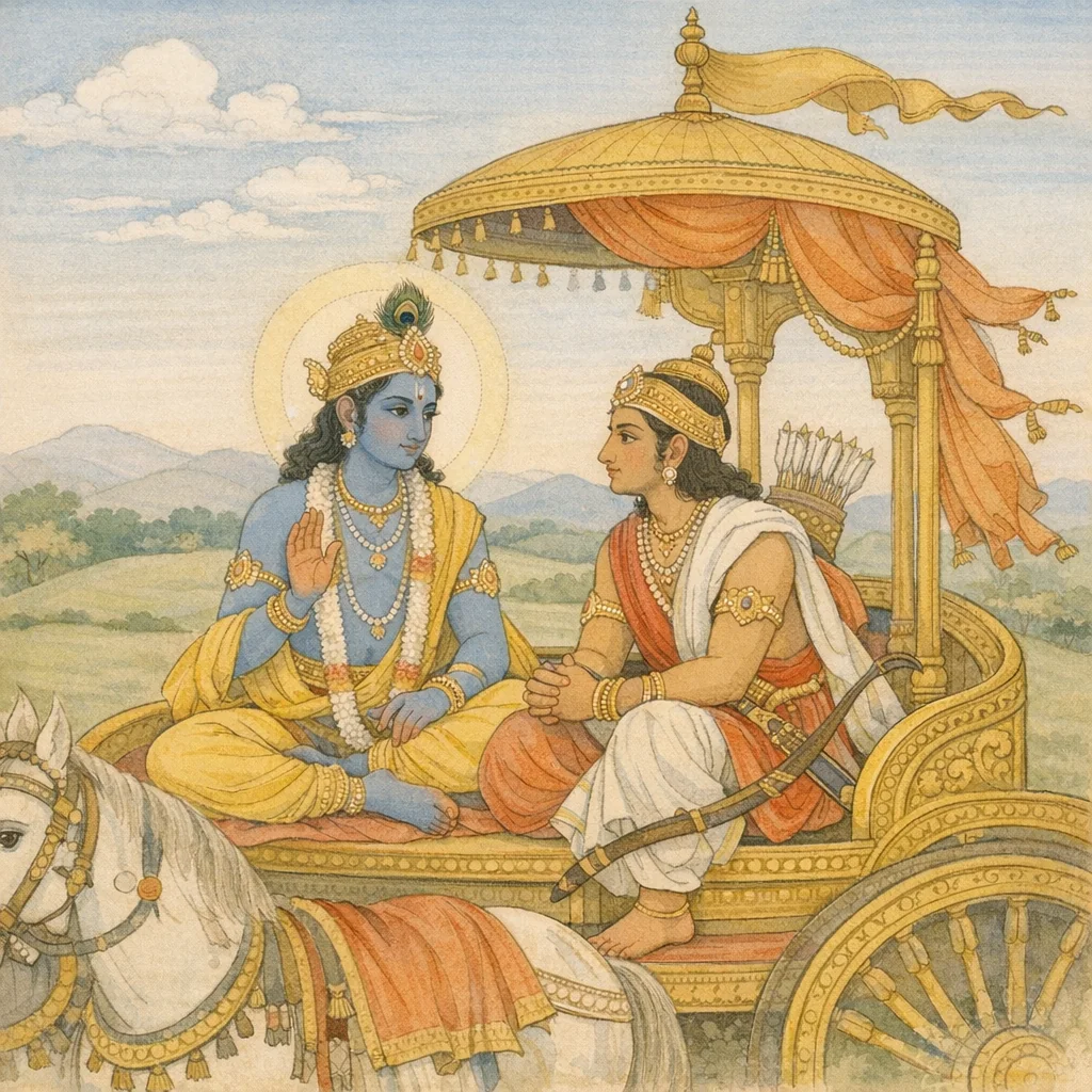 Chapter Arc: अर्जुन के भीतर संशय की धुंध है—भगवान् के वचनों का तात्पर्य उसे ‘मिले हुए-से’ प्रतीत होते हैं; कर्म, बुद्धियोग और त्याग के बीच वह अर्थ खोजता है। → कृष्ण योग की परम्परा का स्मरण कराते हैं—यह राजर्षियों द्वारा जाना गया, पर काल के प्रवाह में लुप्त-सा हो गया। फिर वे बताते हैं कि लोग सिद्धि की आकांक्षा से देवताओं की उपासना करते हैं, और कर्म-फल की चाह मनुष्य को अनेक मार्गों में बाँट देती है। → कृष्ण का निर्णायक उद्घोष—‘परित्राणाय साधूनां, विनाशाय च दुष्कृताम्, धर्मसंस्थापनार्थाय सम्भवामि युगे युगे’—अर्जुन के प्रश्न को केवल युद्ध-नीति नहीं, युग-धर्म के विराट विधान में उठा देता है। → कृष्ण कर्मयोग का सार बाँधते हैं: गुण-कर्म के विभाग से वर्ण-व्यवस्था का विधान, कर्मों का परमात्मा में अर्पण, और ज्ञान से संशय-छेदन। जो योग-संन्यस्त कर्म और ज्ञान-छिन्न संशय है, उसे कर्म बाँध नहीं सकते। → अंतिम आदेश की धार—‘हृदयस्थ अज्ञानजनित संशय को ज्ञानासि से काट; योग में स्थित होकर उठ खड़ा हो’—अर्जुन को निर्णय के द्वार पर छोड़ देता है।
