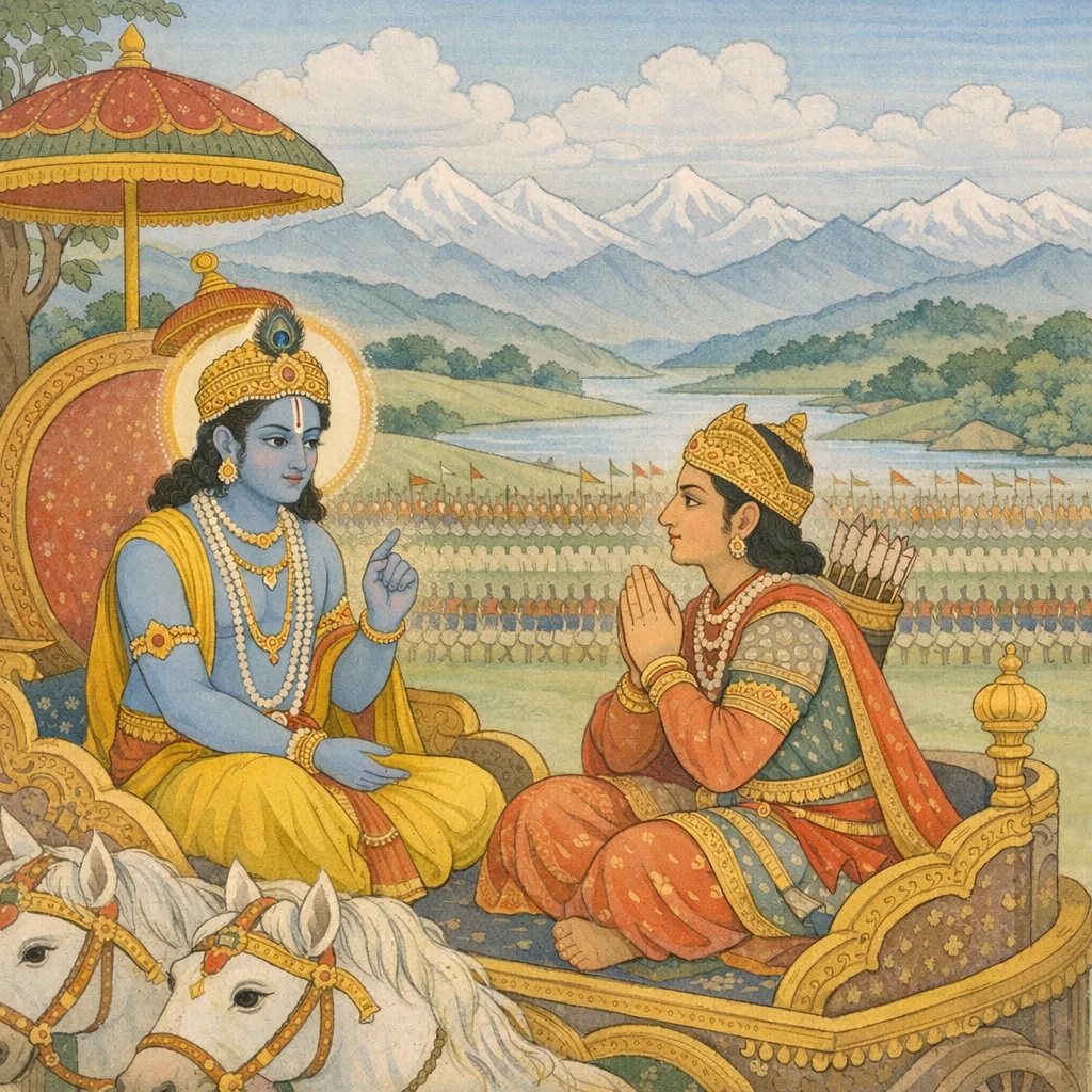 Chapter Arc: कुरुक्षेत्र के रण-प्रांगण में, जहाँ शंखनाद के पीछे मृत्यु की छाया है, श्रीकृष्ण अर्जुन को एक ऐसा ज्ञान देने का वचन देते हैं जिसे जान लेने पर फिर कुछ शेष न रहे—‘ज्ञानं तेऽहं सविज्ञानम्…’। → कृष्ण बताते हैं कि मनुष्य-जीवन में असंख्य भोग—स्त्री, पुत्र, धन, मान, स्वर्ग-सुख—सब ‘कर्मफल’ के भीतर समेटे जा सकते हैं, पर उनसे परे तत्त्व को जानना दुर्लभ है; हजारों में कोई सिद्धि के लिए यत्न करता है और सिद्धों में भी कोई विरला ही तत्त्वतः जान पाता है। → कृष्ण का निर्णायक उद्घोष: समस्त भूत दो प्रकृतियों से उत्पन्न हैं और वही जगत के प्रभव तथा प्रलय हैं—अर्थात् वे ही सर्वस्व, सर्वव्यापक कारण; इसी बोध में ‘वासुदेवः सर्वम्’ की पराकाष्ठा झलकती है। → कृष्ण ज्ञान के फल को स्पष्ट करते हैं—बहुत जन्मों के अंत में ज्ञानवान् शरणागति करता है; जिनका पाप क्षीण हो चुका है वे द्वंद्व-मोह से मुक्त होकर दृढ़-व्रत भक्ति करते हैं; और जो जरा-मरण से मुक्ति हेतु शरण लेते हैं वे ब्रह्म, अध्यात्म और अखिल कर्म का तत्त्व समझते हैं। → अध्याय का संकेत अगले गूढ़ प्रश्न की ओर जाता है—‘साधिभूताधिदैवं… साधियज्ञं… प्रयाणकाले’—अर्थात् अधिभूत, अधिदैव, अधियज्ञ और मृत्यु-क्षण में स्मरण का रहस्य आगे खुलने को है।