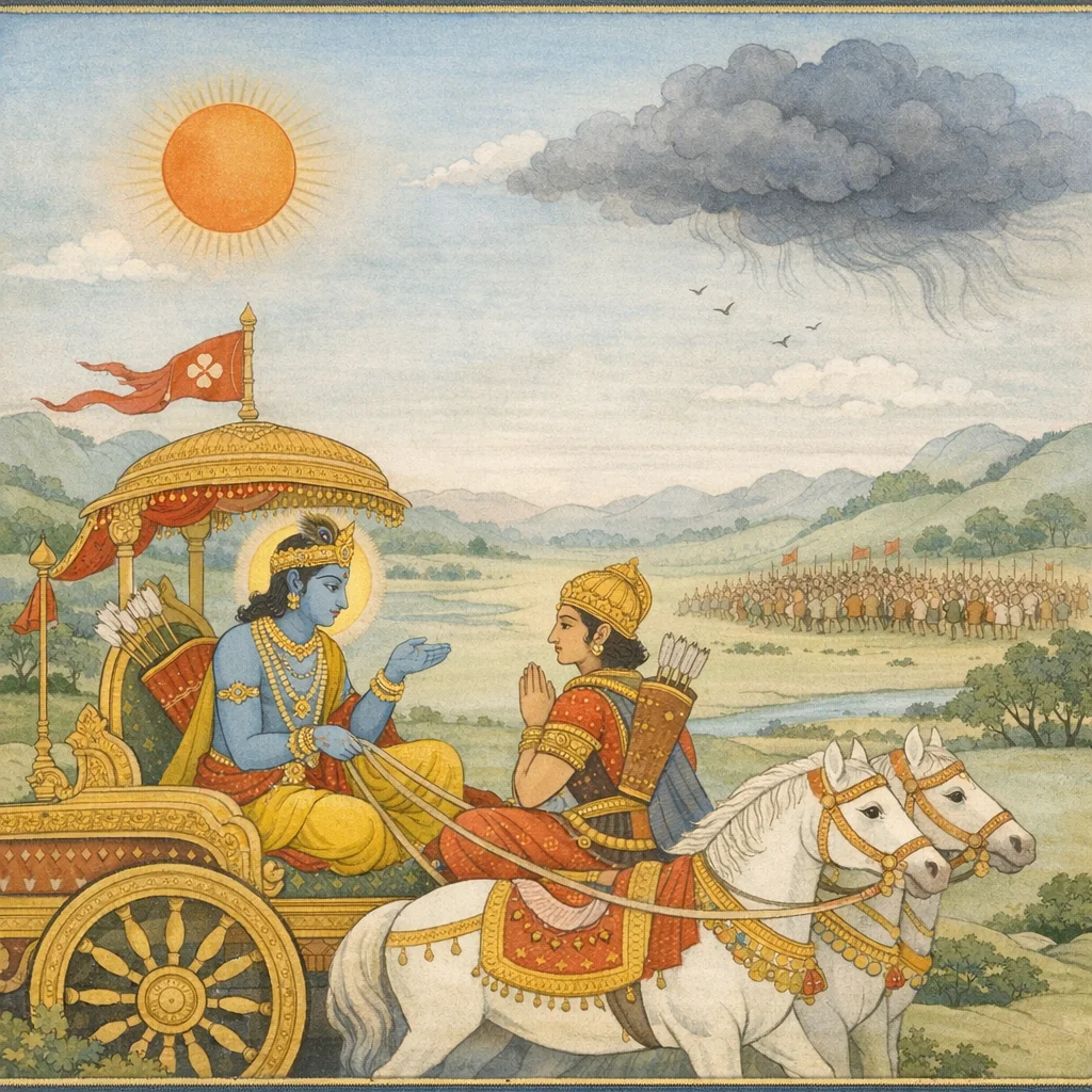 Arjuna, all beings, O son of Kuntī, merge into My own Prakṛti at the end of a cosmic cycle; and when a new cycle begins, I again send them forth. The teaching frames creation and dissolution as a lawful, recurring order under the Divine, inviting steadiness of mind and ethical clarity amid the upheaval of war.