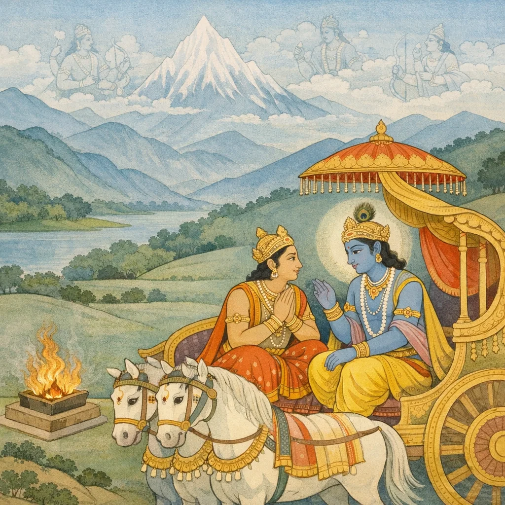 Chapter Arc: Arjuna, overwhelmed by what he has heard, proclaims Krishna as the Supreme Brahman—parama dhāma, parama pavitra—citing the testimony of seers and the inner certainty of his own heart. → Having accepted Krishna’s words as wholly true—beyond the grasp of gods and demons—Arjuna’s hunger to know intensifies; he begs again for an expansive telling of Krishna’s yoga-power and vibhūtis, for the nectar of that hearing never satiates him. → Krishna’s vibhūti-declarations crest in sweeping identifications—among Rudras, Śaṅkara; among Yakṣas and Rākṣasas, Kubera; among Vasus, Fire; among mountains, Meru—each a thunderclap of presence that turns the world into a litany of the Divine. → Krishna closes the catalogue with a boundary-statement: there is no end to His divine manifestations; what has been spoken is only an indication, a brief pointing toward the infinite. → “What need is there of knowing all this in detail?”—Krishna hints at a greater revelation: with a single fragment of Himself He pervades and sustains the entire universe, preparing the mind for the vision that must follow.