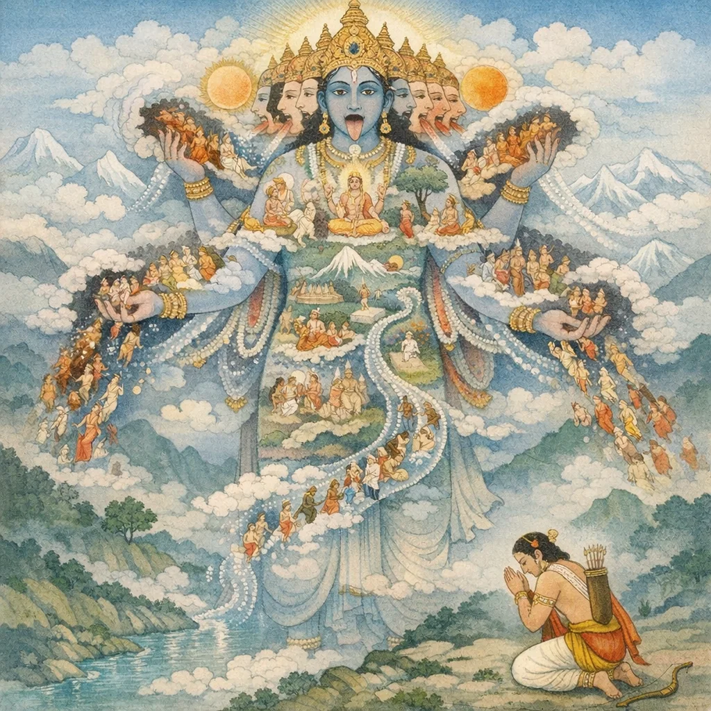The Blessed Lord said: “Behold, O Pārtha, My forms—by the hundreds and by the thousands—manifold, divine, and of many colors and many shapes.” In answer to Arjuna’s reverent longing to truly know what he worships, Kṛṣṇa turns devotion into direct vision, preparing him to bear the moral weight of war with a widened, God-centered understanding of reality.