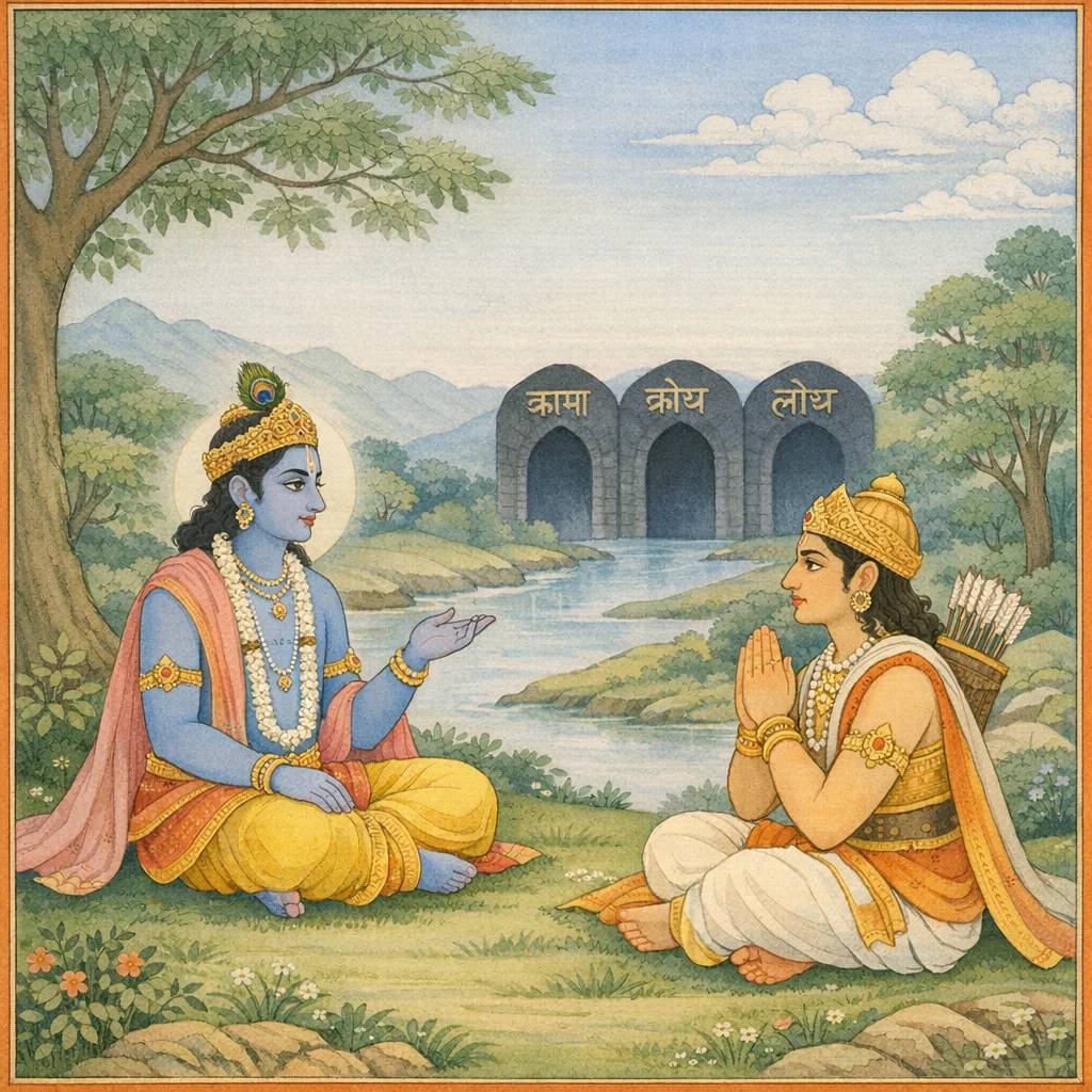 Chapter Arc: कुरुक्षेत्र के रण-कोलाहल के बीच श्रीकृष्ण अर्जुन के भीतर उठती नैतिक उलझन को एक तीखे दर्पण में बदल देते हैं—‘भोक्ता’ कौन है, और कर्म का वास्तविक आधार क्या है? → भगवान् दैवी-सम्पदा के गुणों को क्रमशः उजागर करते हैं—अहिंसा, सत्य, अक्रोध, त्याग, शान्ति, दया, मार्दव, अचापल—और संकेत देते हैं कि युद्धभूमि में भी मन-वाणी-शरीर की शुद्धि ही भीतर की विजय है। इसके समानान्तर वे नास्तिक/आसुरी प्रवृत्ति के स्वभाव पर प्रश्न उठाते हैं: ऐसे मतों को मानने वालों का आचरण कैसा होता है? → आसुरी वृत्ति का निर्णायक चित्रण सामने आता है—‘अनेकचित्तविभ्रान्ता… कामभोगेषु प्रसक्ता… नरकेऽशुचौ पतन्ति’ तथा ‘अहंकार-बल-दर्प-काम-क्रोध’ में आश्रित होकर दूसरों से द्वेष करने वाले। फिर तीन ‘तमोद्वार’ (नरक के द्वार) का निष्कर्षात्मक उद्घोष—इनसे मुक्त होकर ही मनुष्य श्रेय और परमगति की ओर बढ़ता है। → अध्याय का उपसंहार शास्त्र-प्रमाण पर टिकता है—कार्य-अकार्य की व्यवस्था में शास्त्र ही मानक है; शास्त्रविधान जानकर ही कर्म करना चाहिए। इस प्रकार अर्जुन के लिए आचरण का स्पष्ट मानदण्ड स्थापित होता है: दैवी गुणों का आश्रय, आसुरी द्वारों का त्याग, और शास्त्रानुसार कर्म। → शास्त्र-विधि को मानक मान लेने के बाद अगला प्रश्न स्वाभाविक बनता है—यदि कोई शास्त्र को छोड़कर अपनी इच्छा/मान्यता से कर्म करे तो उसकी गति क्या होगी? (अगले अध्याय की ओर संकेत)