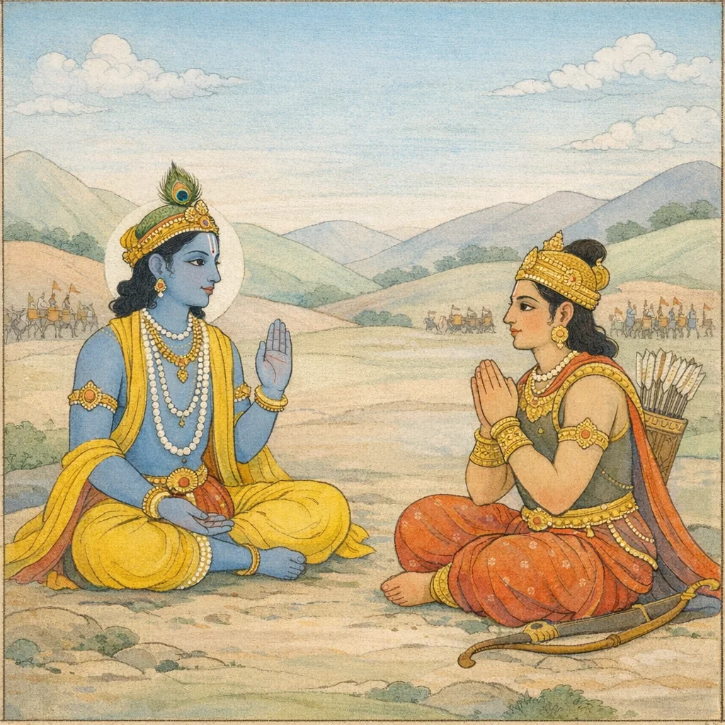 Arjuna declares to Kṛṣṇa: “My delusion has been destroyed, and through your grace, O Acyuta, I have regained clear remembrance and right understanding. I now stand firm, free from doubt, and I will carry out your instruction.” In the ethical setting of the battlefield, this marks the turning point where inner confusion yields to discernment and committed action aligned with dharma rather than personal fear or attachment.