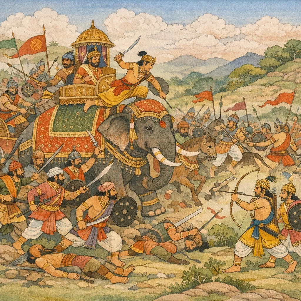 Sañjaya said: A certain heroic warrior, skilled in the ways of battle, stood poised upon an elephant’s tusk and fought on. Just then an opposing combatant—one who knew the training of elephants and the science of weapons—hurled a śakti (a heavy spear) at him. With his chest torn open by that blow, the warrior trembled on the spot, nearing death—an image of how, in war, prowess and daring are still subject to the impartial certainty of weapon-skill and fate.