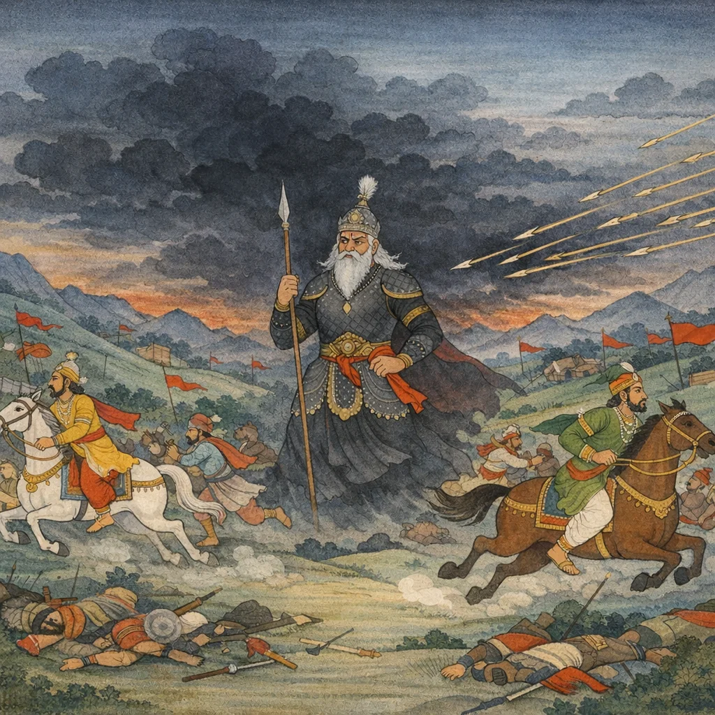 Chapter Arc: धृतराष्ट्र, अपने पुत्रों के भय और आशा के बीच झूलते हुए, संजय से पूछते हैं—उस भयंकर संग्राम में पितामह भीष्म ने पाण्डवों के विरुद्ध क्या किया। → संजय बताता है कि दिन का पूर्वाह्न बीतते-बीतते सूर्य पश्चिमाभिमुख होने लगा, पर रणभूमि की ज्वाला शांत न हुई। चारों ओर ‘ठहरो—मैं ठहरा हूँ’, ‘बींध डालो’, ‘लौटो’ जैसे युद्ध-घोष गूँजते हैं; रथों के यंत्र कटते हैं, ध्वज गिरते हैं, हाथी-बाणों से तपते हैं, और धनंजय के बाण-प्रहार से शत्रु-सेना की पंक्तियाँ टूटती-बिखरती हैं। → भीष्म, काल के समान मुख बाए खड़े दिखाई देते हैं; उन्हें देखकर युधिष्ठिर की ओर के अनेक राजा सिंह से भयभीत मृगों की भाँति भागने लगते हैं। इसी उग्र क्षण में भीष्म का गर्जन-सा संकल्प उभरता है—जो भी मुझे युद्ध में ललकारेगा, मैं द्रोण आदि सहित धार्तराष्ट्र-सेना के उन सबको ‘सानुबन्ध’ (समर्थकों सहित) नष्ट कर दूँगा। → दिन ढलते-ढलते भीषण संहार के बाद, धनंजय शत्रुओं को दबाकर, यश-कीर्ति प्राप्त कर, भाइयों और राजाओं के साथ रात्रि में शिविर लौटते हैं; रण का कोलाहल थमता है, पर भय और प्रतिज्ञाएँ शेष रहती हैं। → अर्जुन भीष्म के गौरव के कारण रण में ‘कर्तव्य’ को लेकर डगमगाता-सा दिखता है—यह संकेत देता है कि भीष्म-वध का प्रश्न अगले प्रसंगों में और तीखा होकर लौटेगा।