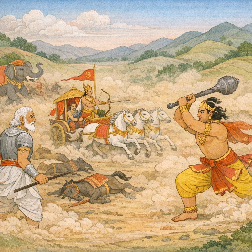 Sañjaya said: That mace appeared exceedingly dreadful—an instrument that could bring down even elephants. Smeared with marrow, fat, flesh, and blood, it looked terrifying, underscoring the brutal, dehumanizing momentum of battle and the moral weight borne by those who wield such force.