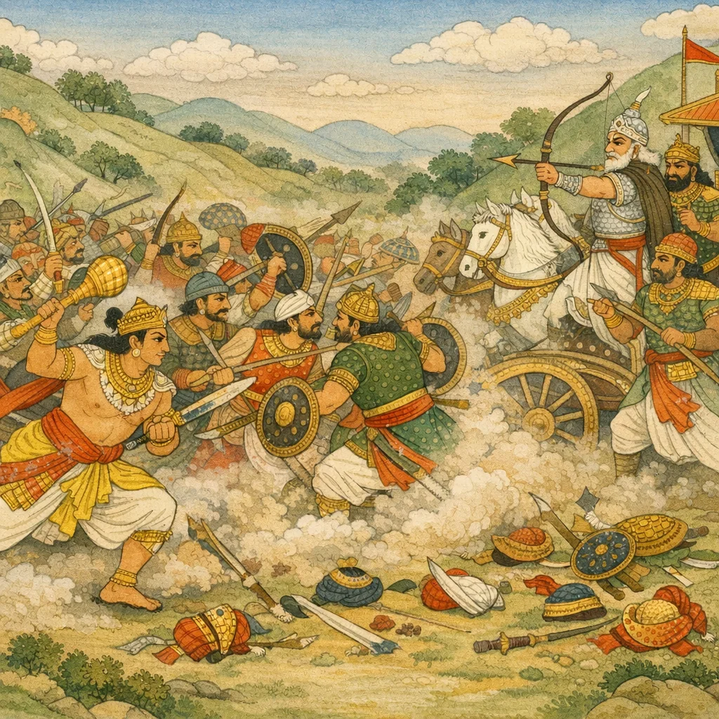 Chapter Arc: पूर्वाह्न में कुरु और पाण्डव राजाओं का महाभयंकर संग्राम आरम्भ होता है—ऐसा युद्ध जिसमें ‘मुख्य शूरों’ का विनाश ही मानो प्रथम फल बनकर उभरता है। → घमासान में गगन छूता कोलाहल उठता है; योद्धा गोशालाओं में भिड़ते महावृषभों की भाँति गर्जते हुए एक-दूसरे पर टूट पड़ते हैं। रणभूमि में घोड़े, हाथी और अनिवर्त रथों के संघात जगह-जगह बनते हैं; सिर, कुण्डल, उष्णीष और स्वर्ण-दीप्त मुकुट कटकर गिरते दिखते हैं। → दुर्योधन कलिंग-वीरों से घिरकर भीष्म को आगे कर पाण्डवों पर चढ़ाई करता है; उधर समस्त पाण्डव क्रोध में भीमसेन को केंद्र बनाकर भीष्म की ओर धावा बोलते हैं—दोनों सेनाओं की धुरी एक ही बिंदु पर आकर टकराती है। → अध्याय का अंत किसी एक निर्णायक वध या विजय पर नहीं, बल्कि ‘संकुल युद्ध’ की घनीभूत अवस्था पर होता है—गिरते, गिराए जाते, छटपटाते योद्धाओं के बीच युद्ध निरन्तर फैलता जाता है। → भीष्म को केंद्र बनाकर दोनों पक्षों की अग्र-व्यूह-टक्कर अब किस महावध की ओर मुड़ेगी—यह अगले प्रसंग के लिए खुला रह जाता है।