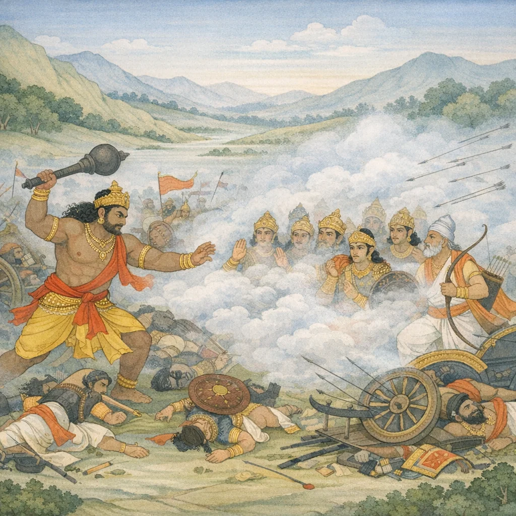 Chapter Arc: संजय धृतराष्ट्र के सामने कठोर सत्य रखता है—यह संकट किसी और का नहीं, स्वयं राजा के ‘आत्मदोष’ और धर्म-संकर को जन्म देने वाले पुराने कर्मों (विशेषतः द्यूत) का फल है। → उसी नैतिक कटाक्ष की पृष्ठभूमि में रणभूमि पर भीमसेन का उग्र पराक्रम भड़क उठता है; धृष्टद्युम्न दूर से उसे शत्रुसेना को ‘दग्ध’ करते देखता है और कौरव-सेना में हाहाकार फैलता है। → द्रुपदपुत्र धृष्टद्युम्न, सामने खड़े कौरव वीरों और धृतराष्ट्र-पुत्रों की घेराबंदी सुन-देख कर, ‘प्रमोहनास्त्र’ का प्रयोग करता है—क्षण भर के लिए युद्ध-यंत्रणा पर मोह का आवरण पड़ता है; साथ ही द्रोण के तीक्ष्ण बाणों से पीड़ित सेना विक्षुब्ध महासागर-सी चक्कर काटती है। → अध्याय का अंत ‘संकुलयुद्ध’ और ‘द्रोणपराक्रम’ की छाप के साथ होता है—पाण्डवों की ओर से भीम का संहारक वेग, और कौरवों की ओर से द्रोण की प्रत्युत्तर-धार, दोनों मिलकर युद्ध को और अधिक उलझा देते हैं। → मोहास्त्र से क्षणिक ठहराव के बाद अगला प्रश्न खुला रह जाता है—क्या द्रोण की प्रचण्ड बाण-वृष्टि पाण्डव-आक्रमण को रोक पाएगी, या भीम-धृष्टद्युम्न का वेग कौरव-व्यूह को तोड़ देगा?