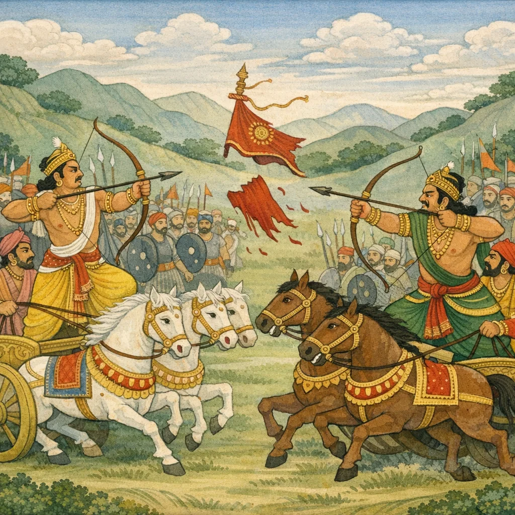 Chapter Arc: रणभूमि में दृढ़ वैरी दुर्योधन को आते देख भीमसेन का क्रोध भड़क उठता है; वर्षों से संचित प्रतिज्ञा का क्षण सामने खड़ा है—“आज या तो तू गिरेगा, या रण छोड़ देगा।” → भीम-दुर्योधन का घोर रथयुद्ध छिड़ता है; प्रहार-प्रतिप्रहार में ध्वज, धनुष और रथ-सज्जा तक कटने लगती है। समानांतर मोर्चों पर अभिमन्यु और द्रौपदीपुत्र धृतराष्ट्रपुत्रों से भिड़ते हैं; उन्मत्त महारथी एक-दूसरे पर टूट पड़ते हैं। → भीम के तीक्ष्ण प्रहार से दुर्योधन के रथ का नानारत्न-विभूषित ध्वज बिजली-सी टूटकर धरती पर गिर पड़ता है—कौरव-गौरव का प्रतीक क्षणभर में धूल में लुढ़क जाता है, और दुर्योधन पराजय-छाया में आ जाता है। → भीम की बढ़त से कौरव पक्ष विचलित होता है, पर भीष्म अपनी महाशक्ति से पाञ्चाल और पाण्डव-सैन्य पर शरवर्षा कर उन्हें यमलोक-मार्ग पर ढकेलते हैं; युद्ध का प्रवाह फिर भीष्म के अनुशासन में लौट आता है। → शतानीक के धनुष कटते ही वह सिंहनाद करता हुआ आगे बढ़ता है, पर दुष्कर्ण के आहत होने पर पाँच महारथी उसे चारों ओर से घेर लेते हैं—अगले क्षणों में शतानीक का भाग्य निर्णायक मोड़ पर लटक जाता है।