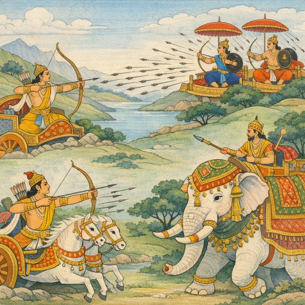Sañjaya said: Irāvān swiftly pierced those two with sharp arrows whose joints were bent. Then those two—fighters famed for their varied and artful combat—struck back in the battle and pierced Irāvān in return. The encounter of these heroes became intensely charged, each answering injury with injury in the relentless rhythm of war.