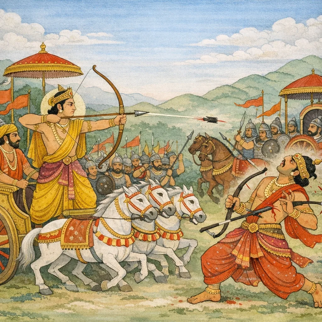 Chapter Arc: सप्तम युद्ध-दिवस की धूल और रण-नाद के बीच धर्मराज युधिष्ठिर स्वयं रथ बढ़ाकर श्रुतायु पर टूट पड़ते हैं—राजा का यह प्रत्यक्ष आक्रमण संकेत देता है कि आज धैर्य नहीं, निर्णायक प्रहार का दिन है। → श्रुतायु तीखे बाणों से युधिष्ठिर को रोकने का यत्न करता है; प्रत्युत्तर में युधिष्ठिर उसके प्रेषित शरों को साधकर लौटा देते हैं। इसी उथल-पुथल में कृपाचार्य भी धनुष त्यागकर तलवार लेकर वेग से धावा बोलते हैं; परिश्रम और घावों से योद्धाओं पर मूर्च्छा का साया पड़ता है, और रथ-रथ की टक्करें रक्त-धारा बनाती जाती हैं। → धनुष कट जाने पर भी युधिष्ठिर अवसर नहीं छोड़ते—वे सबके देखते श्रुतायु के वक्ष में नाराच उतार देते हैं, और रणभूमि में उसका तेज टूटता है; उसी क्षण युद्ध ‘शोणितोदक’—रक्त को जल मानो—ऐसा विकराल रूप ले लेता है। → कृपाचार्य की स्थिति को शकुनि शीघ्र रथ पर चढ़ाकर संभालता है; दोनों पक्ष अपने-अपने प्रमुख रथियों को समेटकर पंक्तियाँ फिर बाँधते हैं। अध्याय का अंत व्यापक संग्राम के फैलाव और भीष्म के दुर्जेय केंद्र के संकेत के साथ होता है—मानो यह सब किसी बड़े टकराव की भूमिका हो। → अर्जुन (श्वेतवाहन) वासुदेव से कुछ कहने को उद्यत होता है—भीष्म के चारों ओर करोड़ों रथियों की भीड़ के बीच अगला निर्णायक प्रसंग उसी संवाद/रण-योजना की ओर मुड़ता है।