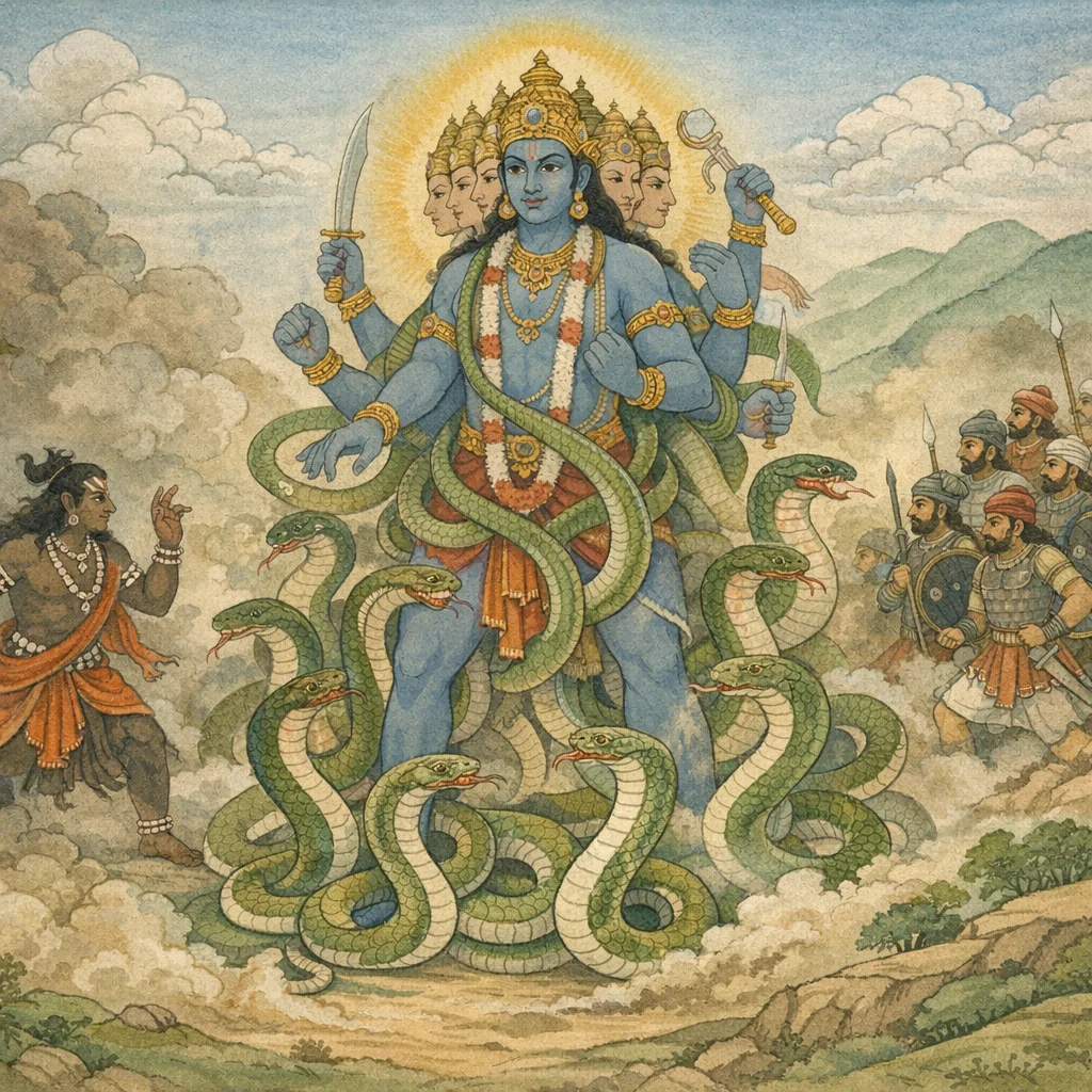 Sañjaya said: “O King, on the battlefield, Irāvān—surrounded by many serpents—assumed an exceedingly vast form, like Ananta, the many-hooded Lord of serpents. In that moment he appeared like Śeṣa himself, enlarging his body to a colossal size, displaying awe-inspiring power amid the violence of war.”