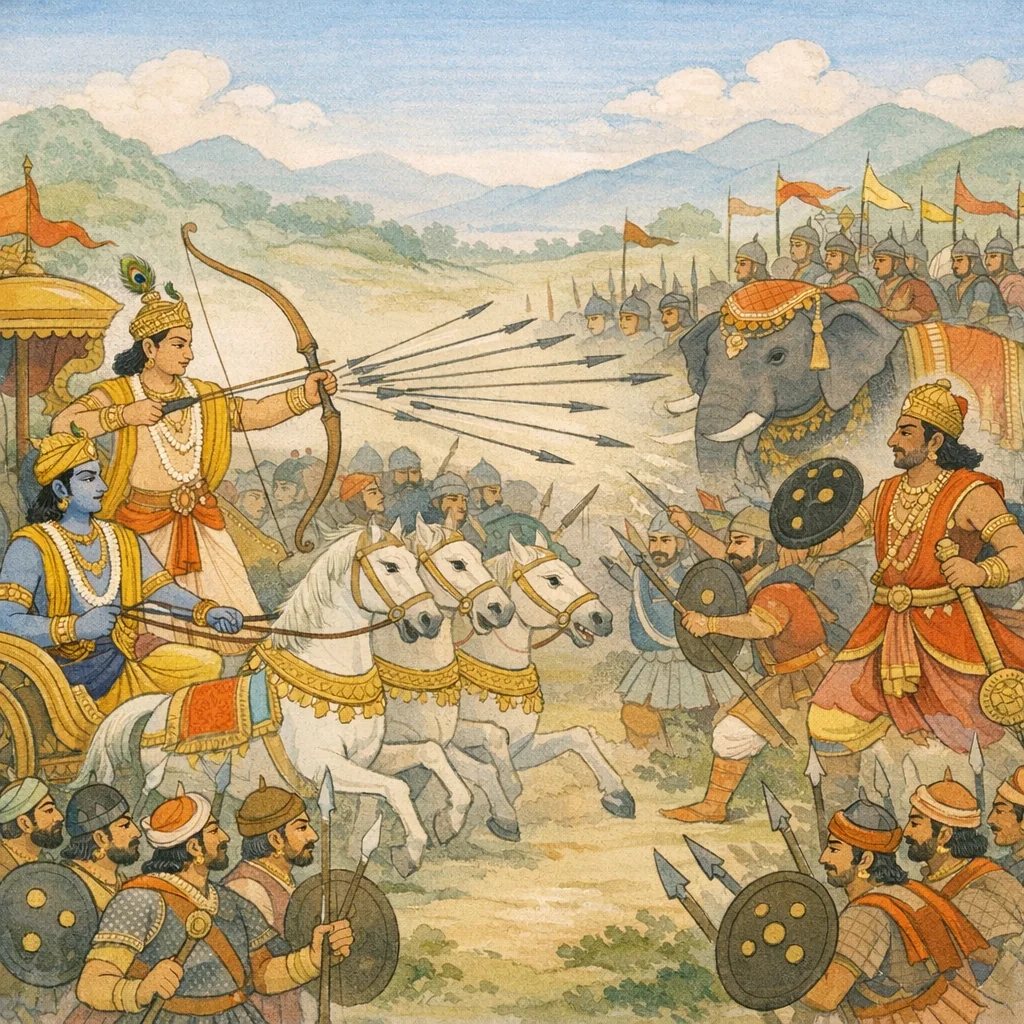 Chapter Arc: संजय धृतराष्ट्र को रणभूमि का दृश्य सुनाते हैं—दुर्योधन स्वयं रथ बढ़ाकर कृष्ण-सारथी अर्जुन के सम्मुख आता है, मानो राजसिंह अपने भाग्य से भिड़ने चला हो। → दुर्योधन तीव्र बाण-वर्षा करता है; वह वासुदेव के वक्षस्थल को भी बाणों से बेधता और रथ के प्रतोद को काट गिराता है। अर्जुन शांत-चित्त होकर शिलाशित, सान-चढ़े बाणों से प्रत्युत्तर देता है; दोनों ओर से शस्त्र-प्रहारों की झड़ी लगती है। दुर्योधन के पक्ष के रथ, हाथी, घोड़े और पदाति-समूह धनंजय को घेरने दौड़ते हैं। → घेराबंदी के बीच अर्जुन अपने अस्त्र-वीर्य से कौरव-वरूथिनी को चीर देता है—शतशः रथ और द्विप गिरते हैं; पर साथ ही अस्त्र-प्रतिअस्त्र का उत्कर्ष दिखता है, जहाँ अश्वत्थामा ‘सर्वास्त्रधातक’ से अर्जुन के बाणों को काट देता है और युद्ध एक क्षण को भयावह तकनीकी शिखर पर पहुँचता है। → कृष्ण अर्जुन का धैर्य और गाण्डीव-बल जाँचते/उत्साह बढ़ाते हैं—‘पहले जैसा बल है न?’—और अर्जुन पुनः संगठित होकर शत्रु-समूह को पीछे ढकेलता है। दुर्योधन फिर भी विषधर-सदृश बाणों से कृष्ण-अर्जुन को घायल कर अपनी जिद और राजधर्म-हठ का परिचय देता है। → अस्त्र का पुनः प्रयोग स्वयं-विनाशक हो सकता है—यह चेतावनी (कि दो बार प्रयोग करने पर अस्त्र अपने ही पक्ष को मार डालेगा) अगले क्षणों में युद्ध को किस सीमा तक ले जाएगी, यह अनिश्चित रह जाता है।
