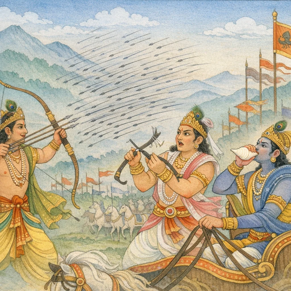 Chapter Arc: संजय धृतराष्ट्र को बताता है कि अर्जुन अकेले ही कौरवों के सुवर्ण-विभूषित महारथियों के घोर व्यूह में घुसकर दिशाओं को ज्वाला-सा प्रकाशित करते हुए शत्रु-समूह से भिड़ गया। → भेरी-झर्झरि-आनक के निनाद से रणभूमि थर्राती है; शल्य, भूरिश्रवा, द्रौणि (अश्वत्थामा), कृप, जयद्रथ आदि एक साथ पार्थ पर बाण-वर्षा करते हैं—रुक्म-पुङ्ख, दुष्प्रेक्ष्य शर आकाश को ढँक देते हैं। → कृष्ण के पांचजन्य की गर्जना समस्त शब्दों को दबाकर रोदसी भर देती है; उसी आवेश में अर्जुन हँसते हुए पाणि-लाघव दिखाता है, शल्य के धनुष को मुष्टि-देश से काट देता है और अनेक महारथियों को एक साथ प्रतिविद्ध कर रण की धुरी पलट देता है। → अर्जुन क्रमशः कर्ण, वृषसेन, शल्य, द्रौणि, कृप, जयद्रथ आदि पर तीव्र प्रत्याघात करता है—किसी का धनुष कटता है, किसी का रथ-बल क्षीण होता है; कौरव-पक्ष की संयुक्त बाण-वृष्टि क्षणिक होकर भी निर्णायक दबाव नहीं बना पाती। → अर्जुन के प्रहारों से कौरव-महारथी क्षुब्ध होकर पुनः संगठित होते हैं—अगला क्षण यह संकेत देता है कि वे और अधिक क्रूर समवेत आक्रमण की तैयारी करेंगे।