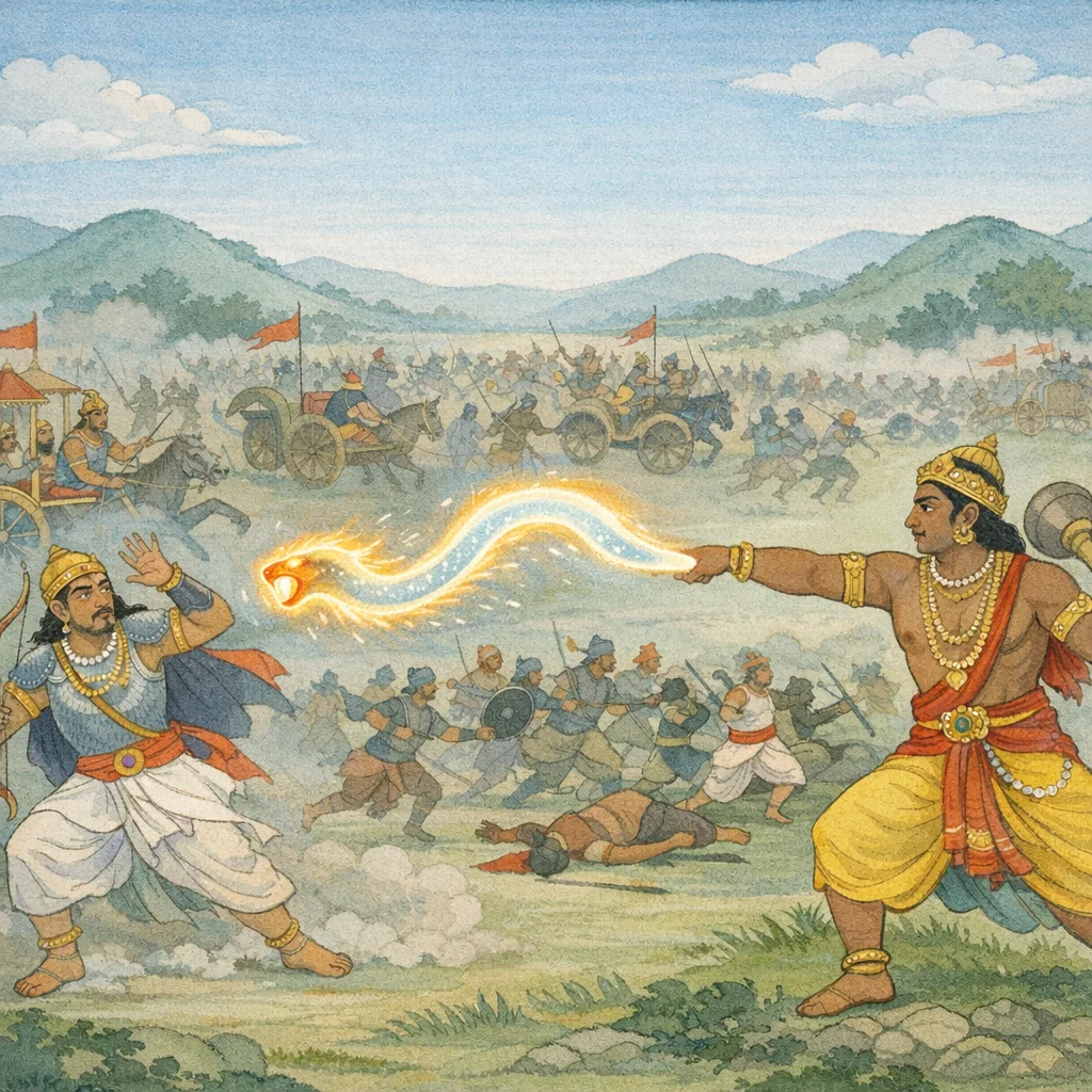 Chapter Arc: धृतराष्ट्र, संजय से युद्धभूमि का हाल पूछते हुए, अपनी ही सेना की ‘सदा पूजित’ और सुगठित व्यवस्था का स्मरण करता है—और उसी स्मरण में भय की दरारें उभर आती हैं। → संजय रणक्षेत्र का दृश्य रखता है: सहस्रों रथ, अश्व और पदाति व्यग्र होकर इधर-उधर धावमान हैं; यह भगदड़ विजय-आशा के क्षय और कौरव-पक्ष के भीतर फैलती निराशा का संकेत बनती है। → भीमसेन अपनी भुजाओं से मुक्त की हुई सर्प-सदृश भयानक शक्ति/शक्ति-आयुध को कृतवर्मा के रथ की ओर फेंकता है; वह दिशाओं को प्रकाशित करती हुई उल्का की तरह आकाश से गिरती प्रतीत होती है और युद्ध का केंद्र एक ही प्रहार पर सिमट आता है। → प्रहार के बाद रणभूमि में क्षणिक ठहराव और पुनर्संयोजन होता है; कौरव-पक्ष अपने योद्धाओं को संभालने का प्रयास करता है, और शिखण्डी को विषण्ण देखकर ‘हार्दिक्य’ (कृतवर्मा) सहित सैनिक उसका सत्कार/संरक्षण करते हैं—मानो मनोबल को वस्त्रों की तरह झाड़-पोंछ कर फिर पहनाना हो। → महाधनुर्धर महारथी (कृतवर्मा/प्रतिद्वन्द्वी) क्रोध में हँसते हुए तीन-तीन बाणों से भीम को गहरी चोट पहुँचाता है—अगला क्षण पूछता है: क्या भीम इस प्रतिघात को और उग्र प्रतिशोध में बदल देगा?