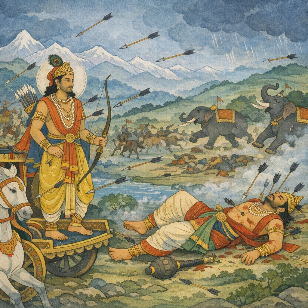 Chapter Arc: संजय धृतराष्ट्र से कहता है—राजन्, एकाग्रचित्त होकर सुनो: जिस घड़ी कौरव-सेना का भयंकर निनाद उठा, उसी क्षण शैनेय सात्यकि बिजली की तरह कृतवर्मा पर टूट पड़ा, मानो पाण्डवों की डूबती आशा का दीपक स्वयं रण में उतर आया हो। → दुर्योधन के आदेश से त्रिगर्त और अन्य दल ‘मदर्थे त्यक्तजीविता’ होकर सात्यकि को घेरते हैं। सात्यकि के वज्र-स्पर्शी बाण हाथियों की गजसेना को उथला देते हैं—कोई चक्कर काटता है, कोई लड़खड़ाता है, कोई धराशायी होता है; कौरव योद्धा विमुख होकर इधर-उधर भागते दिखते हैं। पर इसी कोलाहल में जलसंध जैसे महाबली आगे बढ़ते हैं और सात्यकि को रोकने का संकल्प लेते हैं। → जलसंध क्रोध में भरकर शिनि-पौत्र सात्यकि की विशाल छाती पर भारी, भार-सह बाणों से गहरा आघात करता है; फिर भी ‘नाकम्पत महाबाहुः’—सात्यकि विचलित नहीं होता। उसी अडिग क्षण में सात्यकि प्रत्याघात कर जलसंध का वध कर देता है, और रणभूमि पर यह अद्भुत-सा दृश्य बन जाता है कि घायल होकर भी धर्म-रथ का सारथि-योद्धा डगमगाता नहीं। → जलसंध के गिरते ही त्रिगर्तों की गजसेना का संहार पूर्ण होता है; हाथी दल टूटकर भागता है और कौरव पंक्तियाँ बिखरती हैं। कृतवर्मा भी सात्यकि के वेग से दबता है—कौरव पक्ष की ‘आशा’ क्षीण और पाण्डव पक्ष की ‘प्राणवायु’ प्रबल होती है। → पर रण का शोर थमता नहीं—कृतवर्मा और शेष कौरव-वीर पुनः संगठित होने को हैं; सात्यकि आगे किस घेराबंदी में फँसेगा, यह अगले प्रसंग की धार पर छोड़ दिया जाता है।
