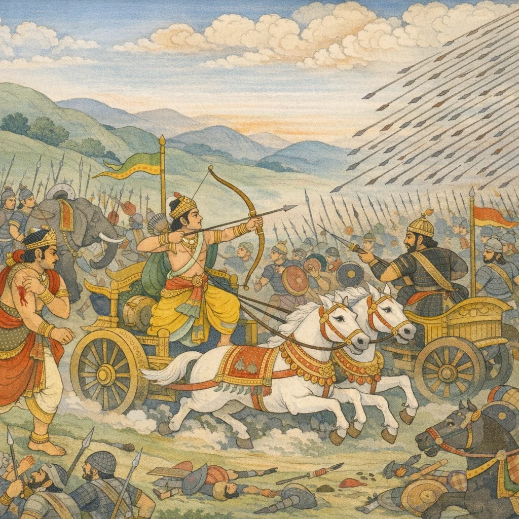 Chapter Arc: संजय धृतराष्ट्र को बताता है कि रणभूमि में सात्यकि का पराक्रम भड़क उठा है—वह अकेला ही आपके महारथियों की भीड़ में घिरकर भी रुकता नहीं, और दुर्योधन-कृतवर्मा की प्रतिष्ठा को फिर चुनौती देता है। → द्रोणाचार्य सात्यकि पर तीक्ष्ण बाण-वर्षा करते हैं—सतहत्तर शरों से उसे घायल करते हैं; दुर्मर्षण, दुःसह और विकर्ण भी क्रमशः अनेक बाणों से उसे बेधते हैं। सात्यकि पर चारों ओर से आच्छादन होता है, पर वह एक-एक को प्रत्युत्तर देकर फिर-फिर नए बाणों से छेदता है और दुर्योधन तक को त्वरित आघात देता है। → सात्यकि विधिपूर्वक सज्जित रथ से ‘धनुर्धरों के आदर्श’ कृतवर्मा के सामने जा टिकता है; अर्जुन-दर्शन की उत्कंठा से प्रेरित होकर वह अस्सी बाणों की वर्षा करता है और फिर सुवर्ण-पंखों वाला प्रचण्ड बाण छोड़ता है—क्रुद्ध सर्प-सा दहकता हुआ। इसी उग्रता में दुर्योधन भी सात्यकि के श्रेष्ठ बाणों से क्षत-विक्षत होकर सहसा पीछे हटता/भागता है। → कृतवर्मा भी प्रत्युत्तर को तत्पर होता है; सारथी को आदेश मिलता है कि ‘सर्वधन्विनां प्रवर’ कृतवर्मा तीव्र वेग से आ रहा है—रथ बढ़ाओ। अध्याय का अंत इस पर होता है कि सात्यकि की धारा ने कौरव-पक्ष को क्षणिक रूप से डगमगाया, पर कृतवर्मा का प्रतिघात अब सामने है। → कृतवर्मा के तीव्र प्रत्याक्रमण में सात्यकि टिकेगा या मार्ग बनाकर अर्जुन तक पहुँचेगा?