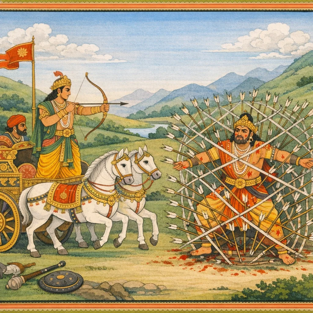 Sañjaya said: Having made their resolve firm for battle, and having become ‘Saṁśaptakas’ by taking a mutual vow, they surrounded them with a vast formation of chariots. As they charged into the fight, they released showers of arrows. The passage highlights the grim ethic of wartime vows: steadfastness and collective oath can become instruments of relentless violence when yoked to enmity and ambition.
