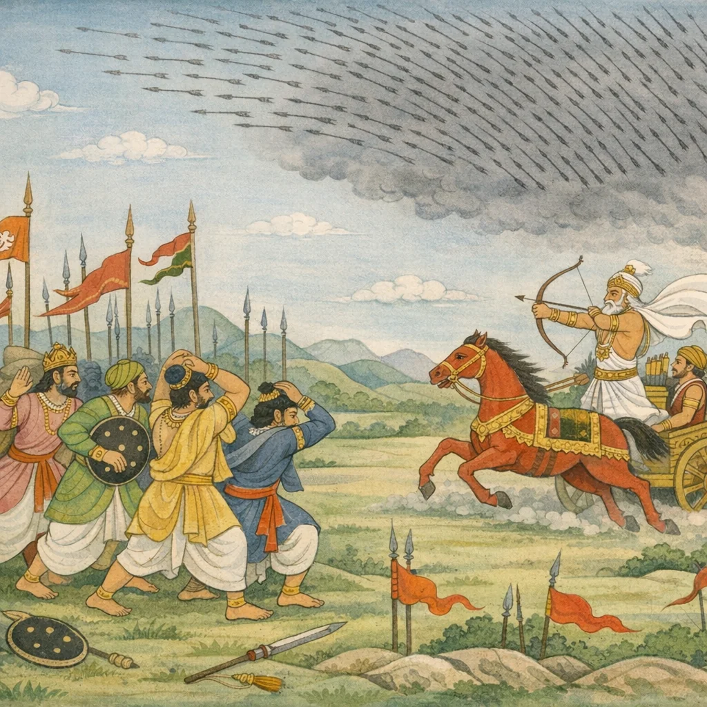 Sañjaya said: Scorched by the sun overhead and struck down by volleys of arrows, the Pāñcāla warriors, their minds seized by fear, then fell into confusion and distress.
