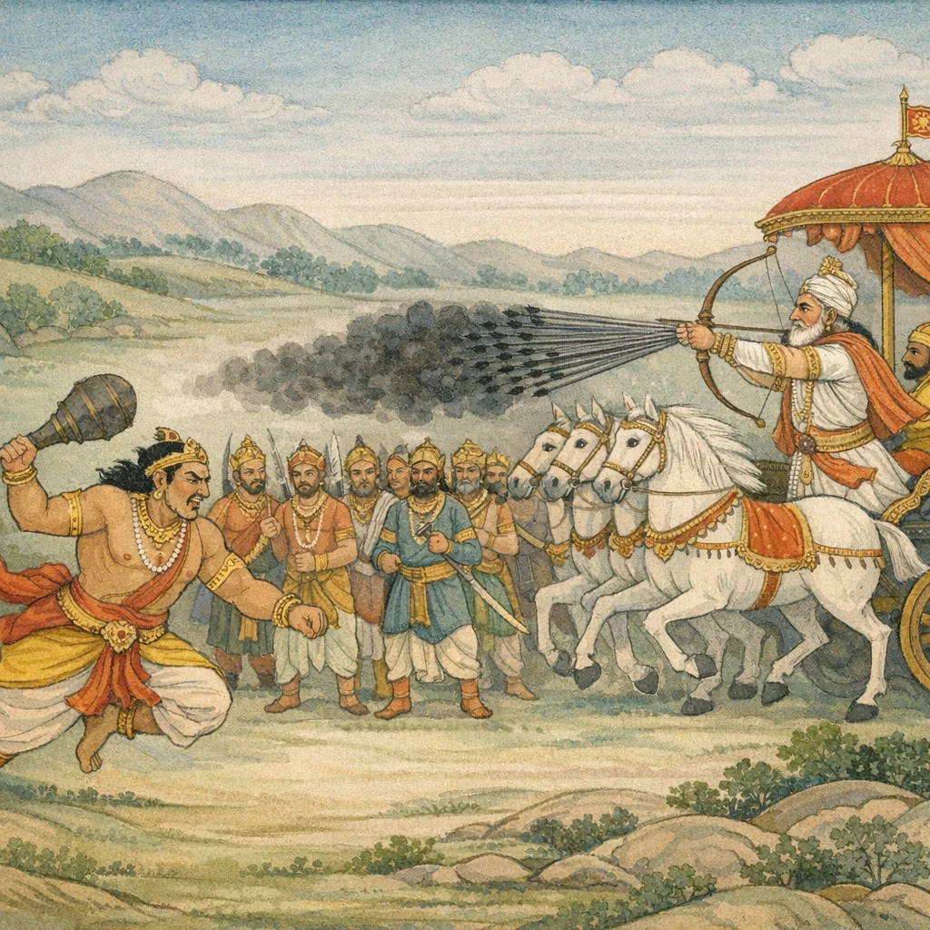 Chapter Arc: रथसेना को चीरकर आगे बढ़े भीमसेन को रोकने के लिए आचार्य द्रोण हँसते-हँसते बाण-वर्षा आरम्भ करते हैं—मानो गुरु का कौशल स्वयं रणभूमि पर गरज उठा हो। → द्रोण के धनुष से छूटे शर-समूहों को ‘पीते हुए-से’ भीम वेग से आगे बढ़ते हैं, पर दुर्योधन के प्रेरित अनेक महाधनुर्धर नरेश चारों ओर से घेर लेते हैं। द्रोण के तीक्ष्ण बाणों से सैकड़ों-हजारों वीर कटने लगते हैं; भीम का आवेग और कौरव-पक्ष की संगठित रोक—दोनों एक साथ चढ़ते हैं। → रण में द्रोण की बाण-वृष्टि के बीच भीम का उन्मत्त गर्जन और उसके प्रत्युत्तर में धर्मराज युधिष्ठिर का मन-ही-मन धैर्यपूर्ण, मुस्कराता हुआ संकल्प—युद्ध की बाहरी हिंसा के भीतर नेतृत्व की आंतरिक स्थिरता का टकराव चरम पर पहुँचता है। साथ ही अर्जुन के जीवित होने और उसके पूर्व-पराक्रम (कालकेयों के संहार) का स्मरण सैनिकों के मन में निर्णायक आशा/भय जगाता है। → अध्याय का स्वर निर्णायक निष्कर्ष से अधिक ‘रण-स्थिति का लेखा’ बनता है: द्रोण की रोक, भीम की धृष्टता, और पाण्डव-पक्ष में अर्जुन के जीवित होने से उपजी आश्वस्ति—इन तीनों के बीच युद्ध का संतुलन क्षणिक रूप से थमता नहीं, बल्कि और कसता है। जयद्रथ-वध की प्रतिज्ञा की छाया भी कथा को अगले चरण की ओर धकेलती है। → क्या अर्जुन के हाथों जयद्रथ का वध देखकर दुर्योधन का मन टूटेगा और वह संधि की ओर झुकेगा—या प्रतिशोध में युद्ध और उग्र होगा?